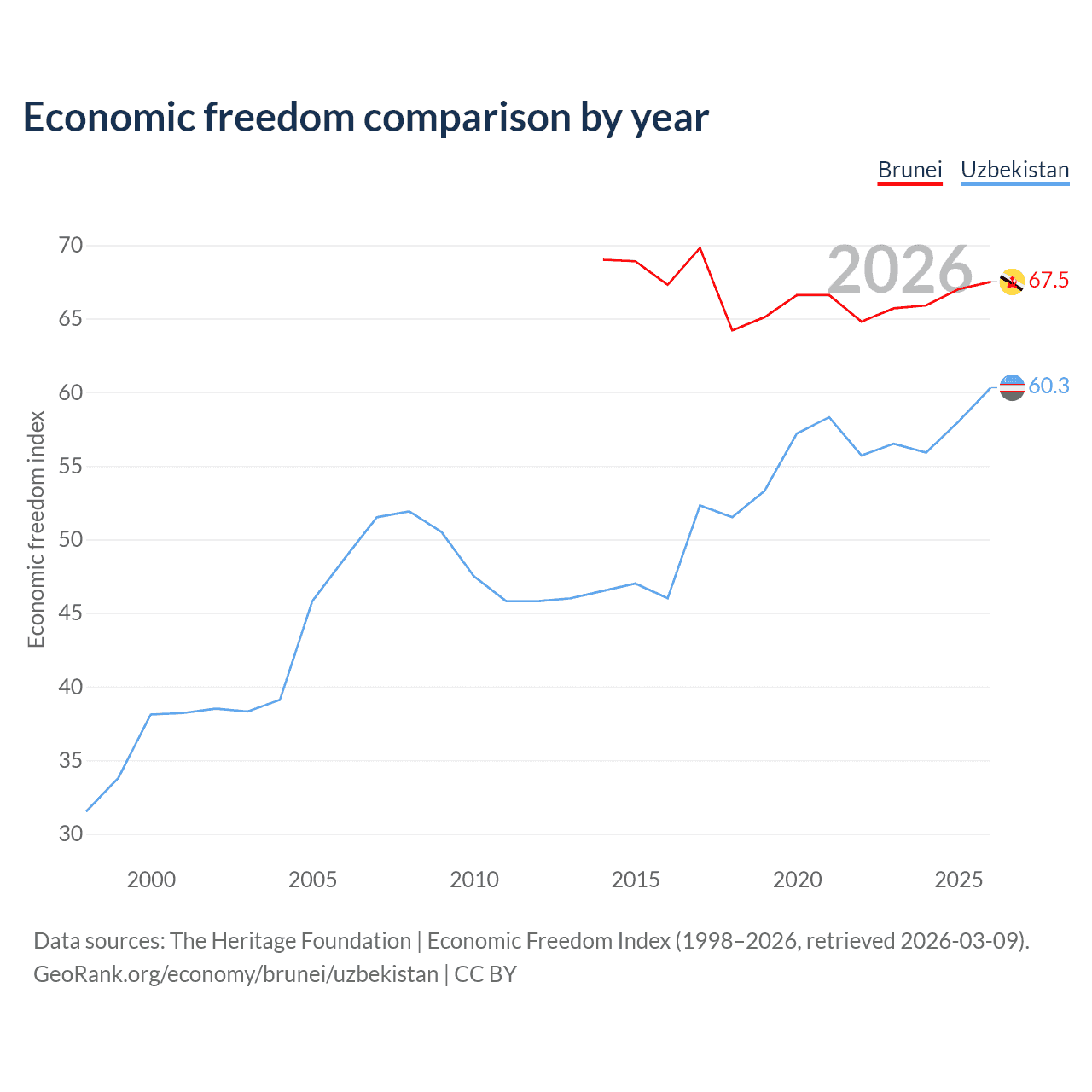 The Economic Freedom Index for Brunei is 67.5, ranking 55/197, compared to 60.3 for Uzbekistan, ranking 94/197. The chart above displays a comparison of annual changes in economic freedom indexes.