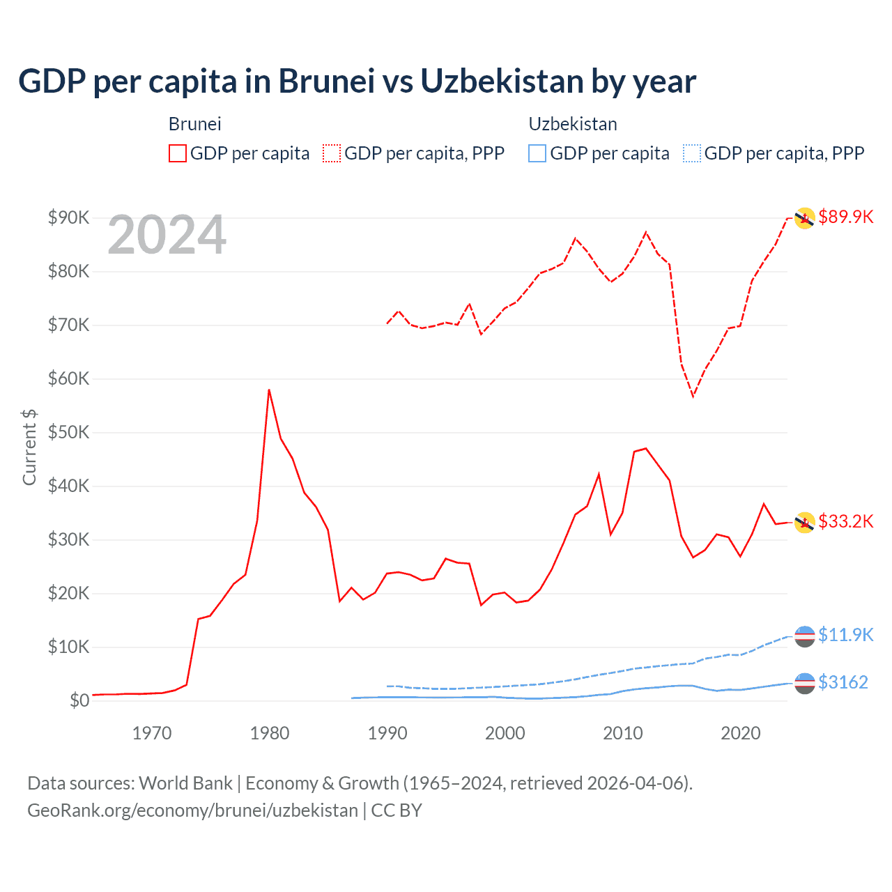 GDP per capita in Brunei vs Uzbekistan by year