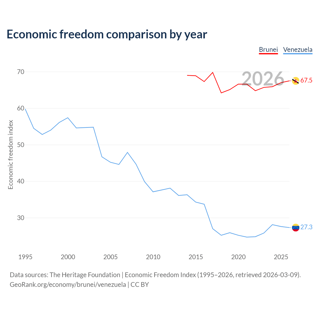 The Economic Freedom Index for Brunei is 67.5, ranking 55/197, compared to 27.3 for Venezuela, ranking 194/197. The chart above displays a comparison of annual changes in economic freedom indexes.
