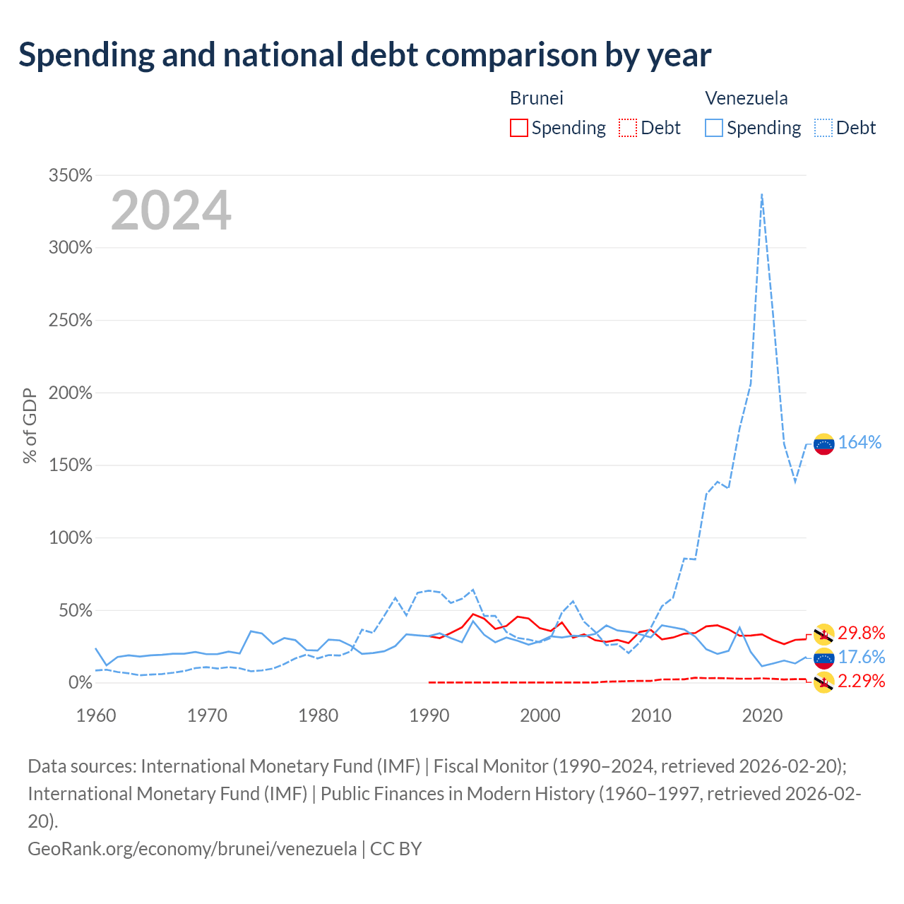 Brunei has $351M in government debt (2.29% of GDP), compared to $197B (164.3% of GDP) in Venezuela.