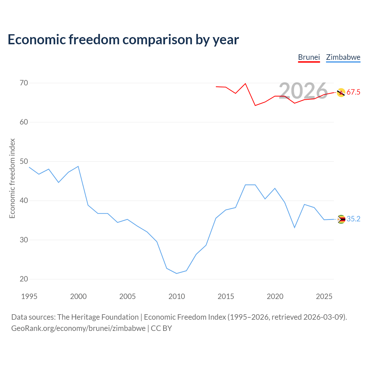 The Economic Freedom Index for Brunei is 67.5, ranking 55/197, compared to 35.2 for Zimbabwe, ranking 190/197. The chart above displays a comparison of annual changes in economic freedom indexes.