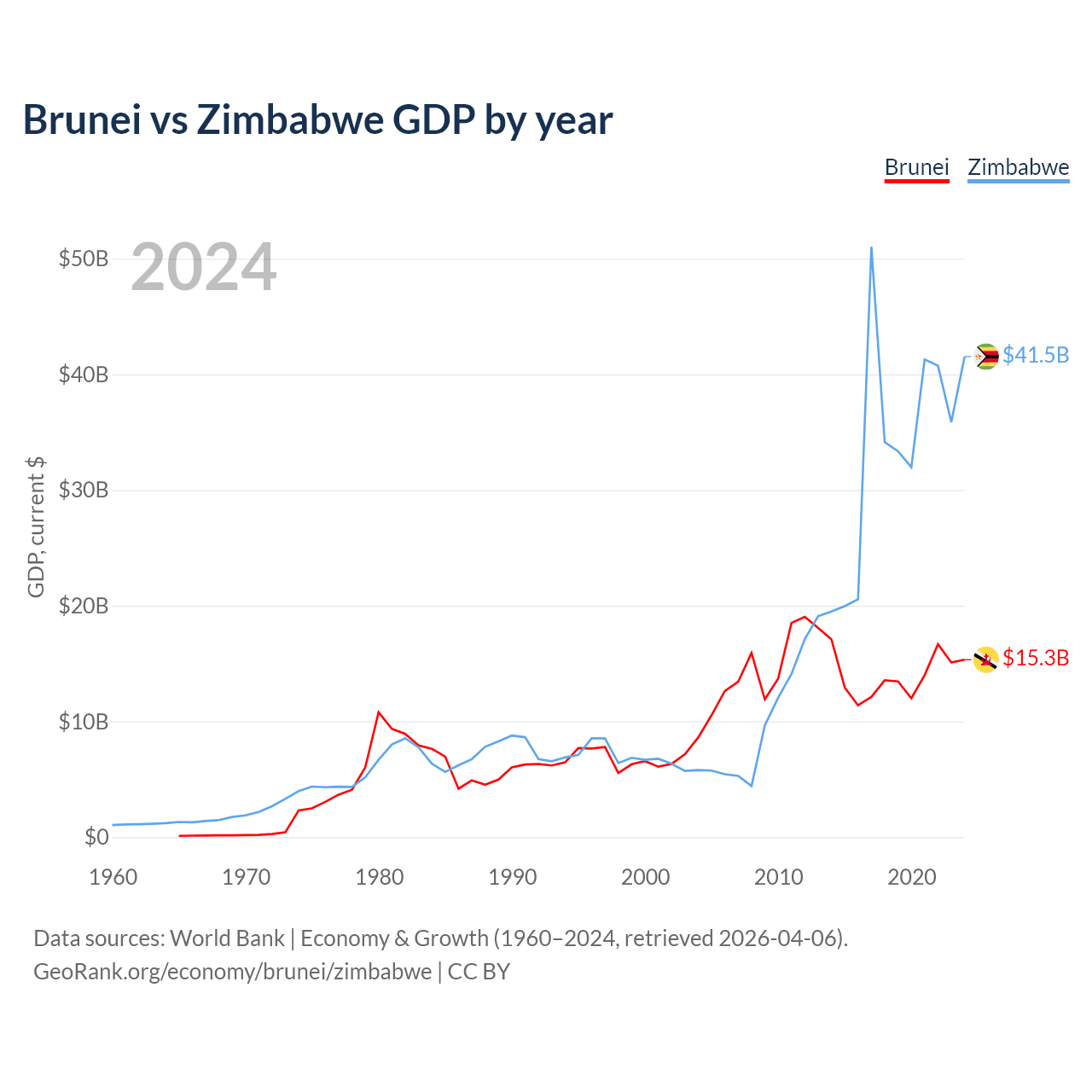 Brunei has a GDP of $15.3B compared to $41.5B for Zimbabwe, ranking 142/197 and 102/197 by economy size, respectively.