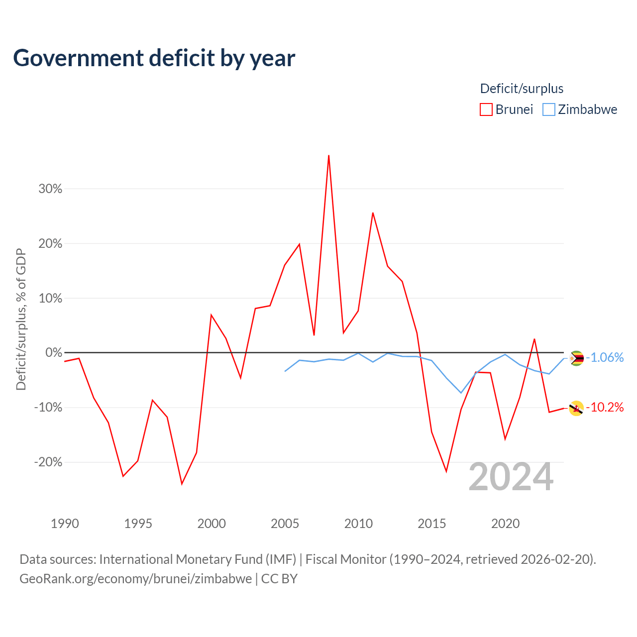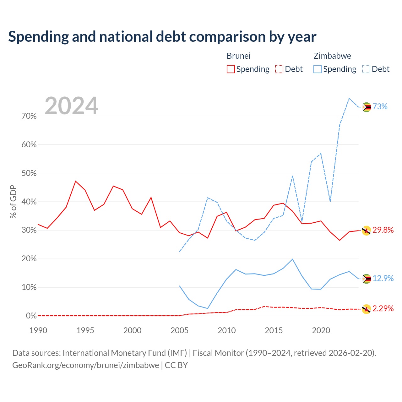 Brunei has $351M in government debt (2.29% of GDP), compared to $30.3B (73% of GDP) in Zimbabwe.
