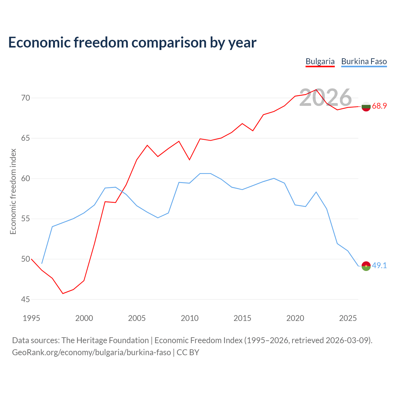 The Economic Freedom Index for Bulgaria is 68.9, ranking 44/197, compared to 49.1 for Burkina Faso, ranking 167/197. The chart above displays a comparison of annual changes in economic freedom indexes.