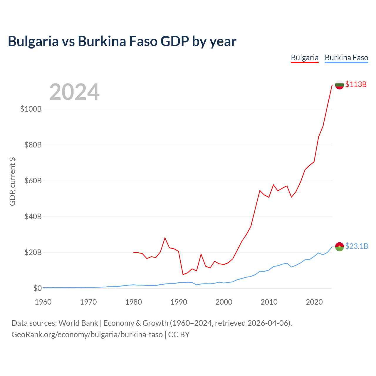 Bulgaria has a GDP of $113B compared to $23.1B for Burkina Faso, ranking 67/197 and 122/197 by economy size, respectively.