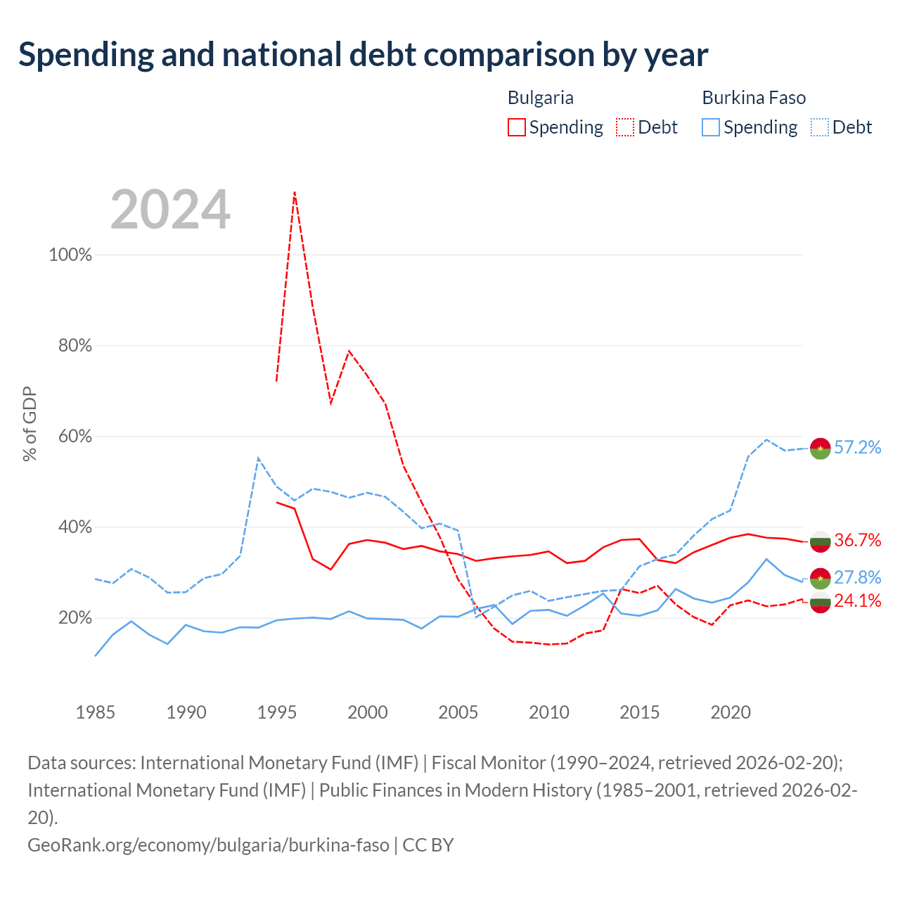 Bulgaria has $27.3B in government debt (24.1% of GDP), compared to $13.2B (57.2% of GDP) in Burkina Faso.