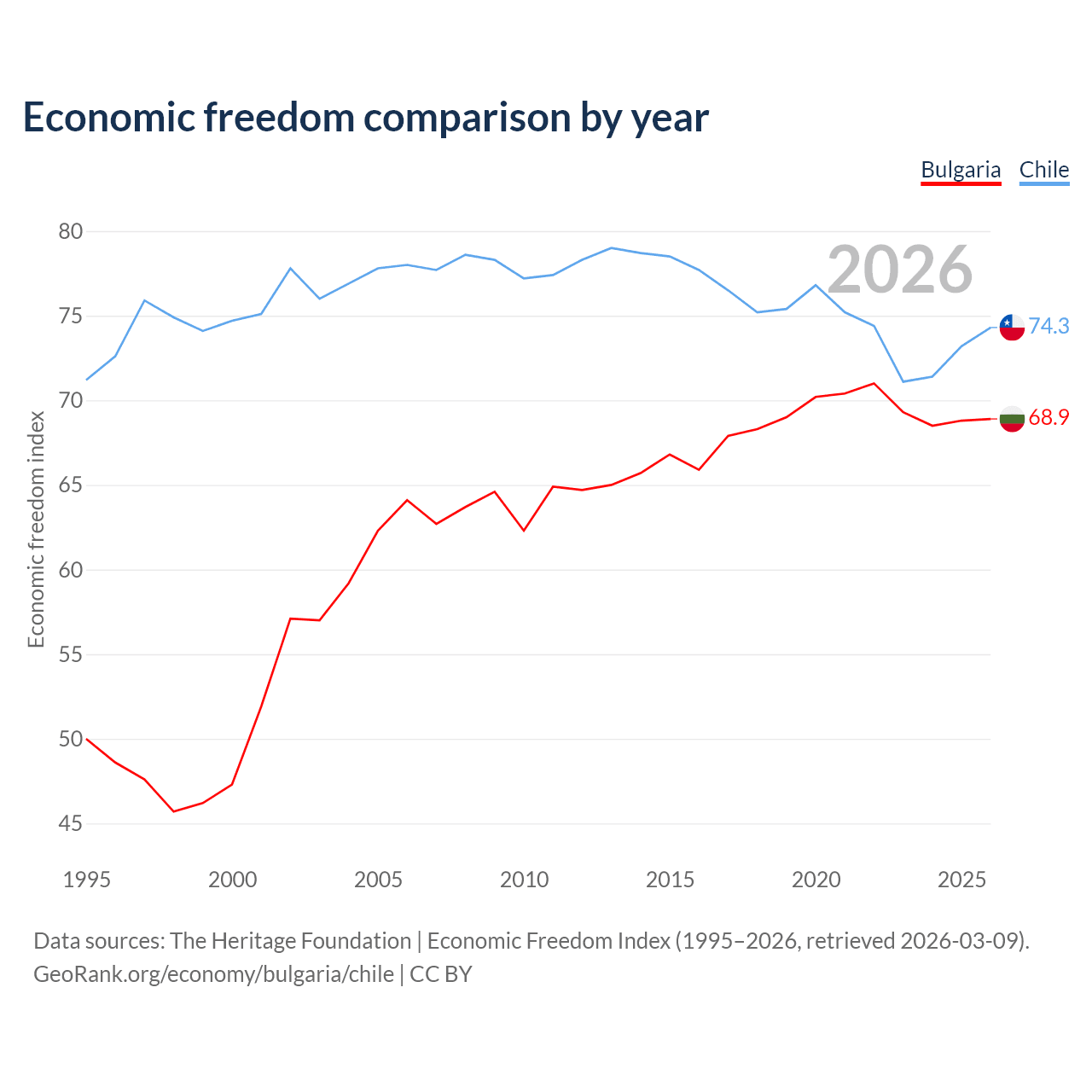 The Economic Freedom Index for Bulgaria is 68.9, ranking 44/197, compared to 74.3 for Chile, ranking 20/197. The chart above displays a comparison of annual changes in economic freedom indexes.