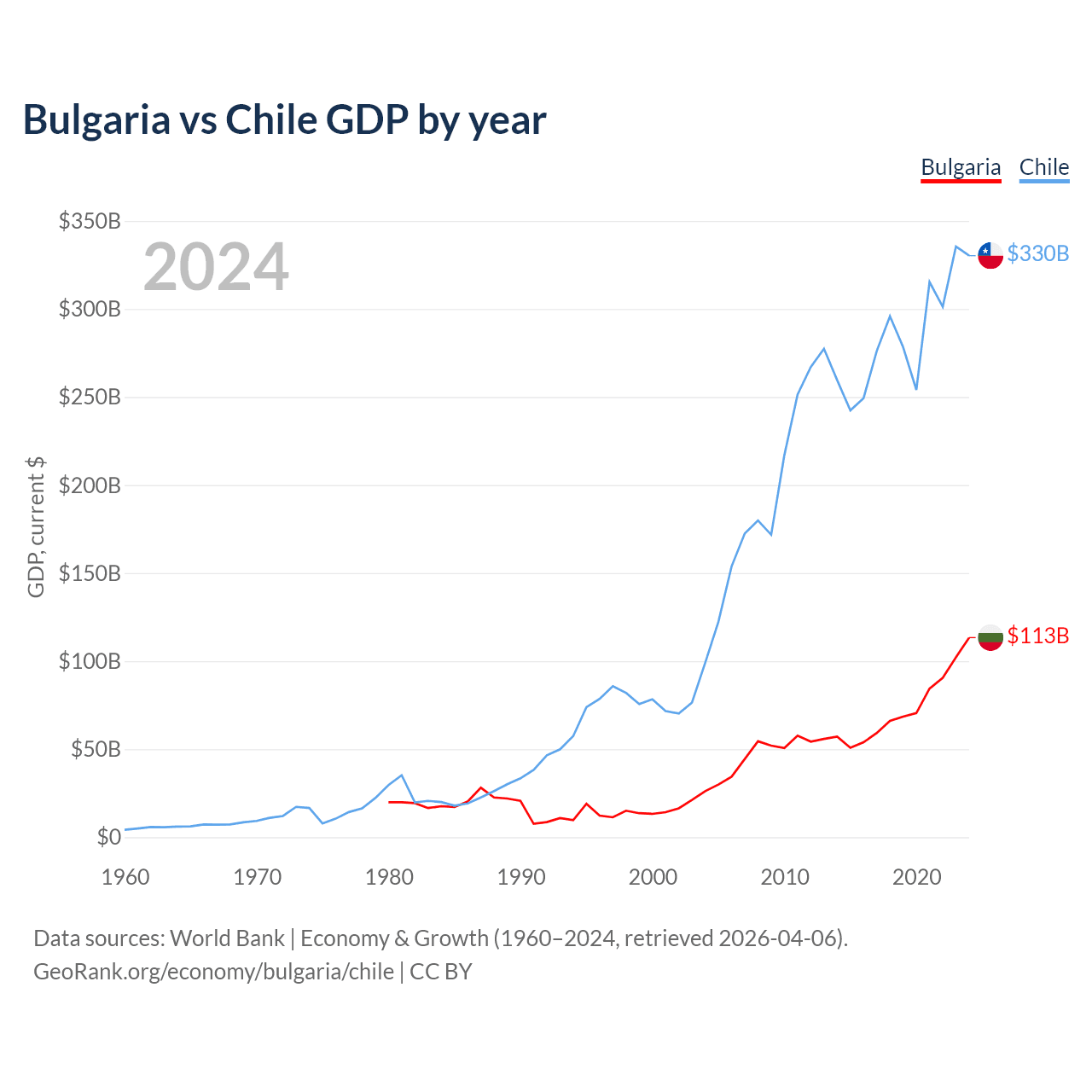 Bulgaria has a GDP of $113B compared to $330B for Chile, ranking 67/197 and 45/197 by economy size, respectively.