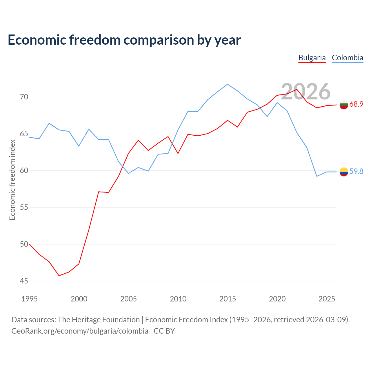 The Economic Freedom Index for Bulgaria is 68.9, ranking 44/197, compared to 59.8 for Colombia, ranking 101/197. The chart above displays a comparison of annual changes in economic freedom indexes.