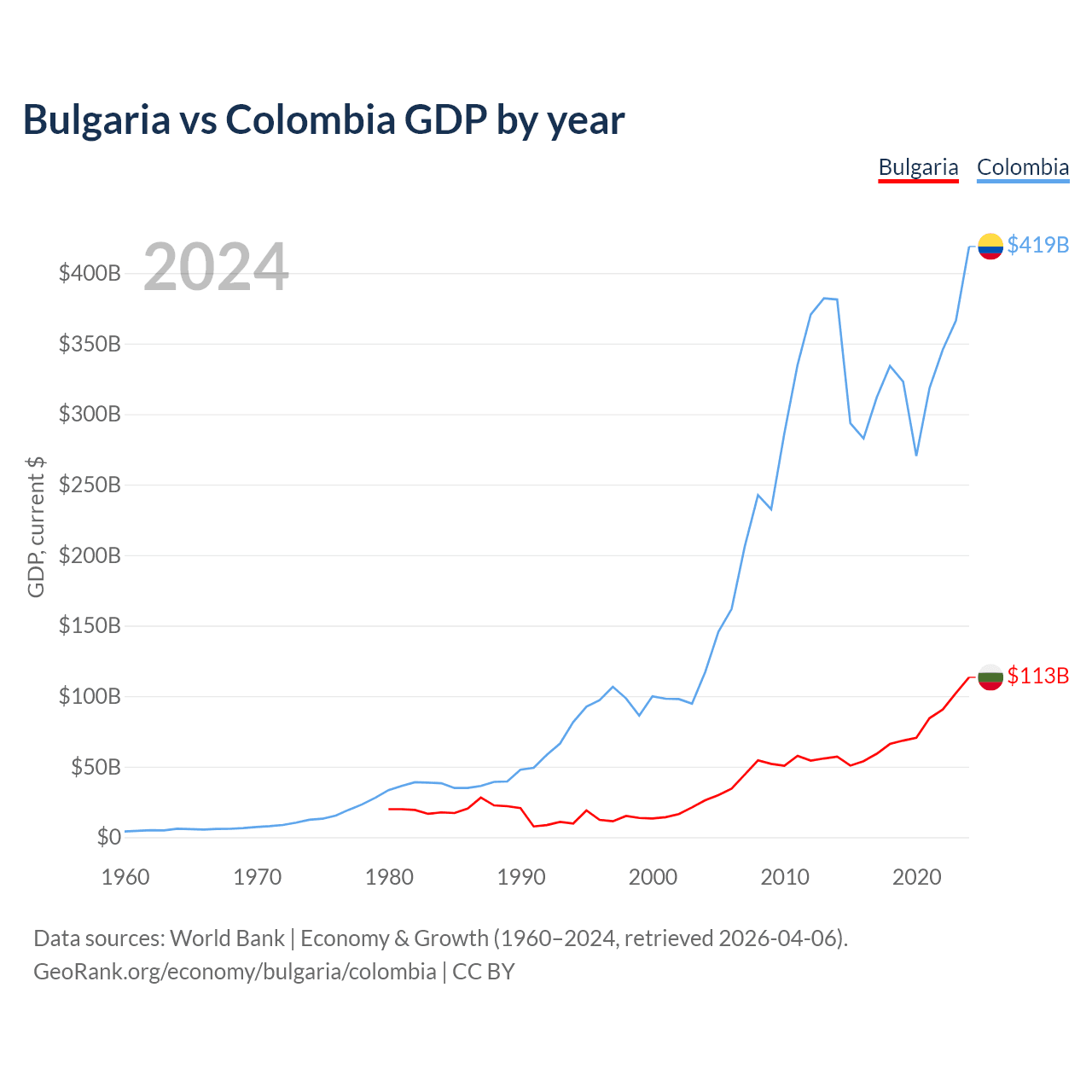 Bulgaria has a GDP of $113B compared to $419B for Colombia, ranking 67/197 and 39/197 by economy size, respectively.