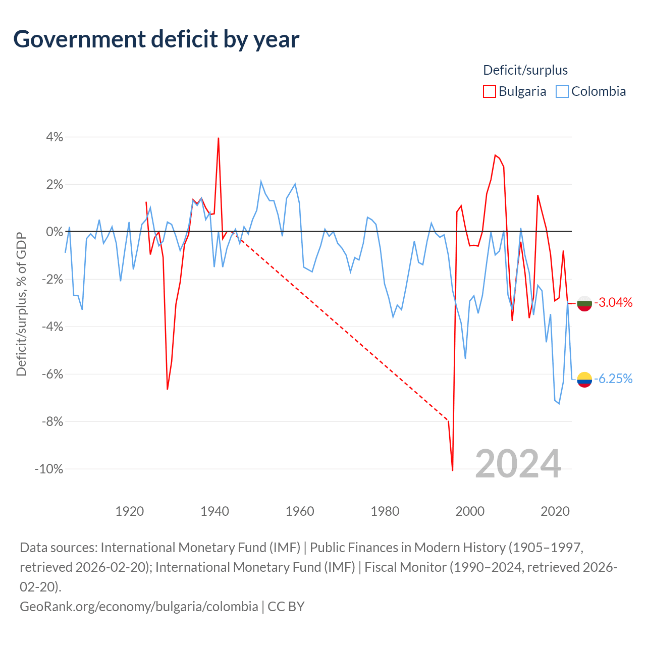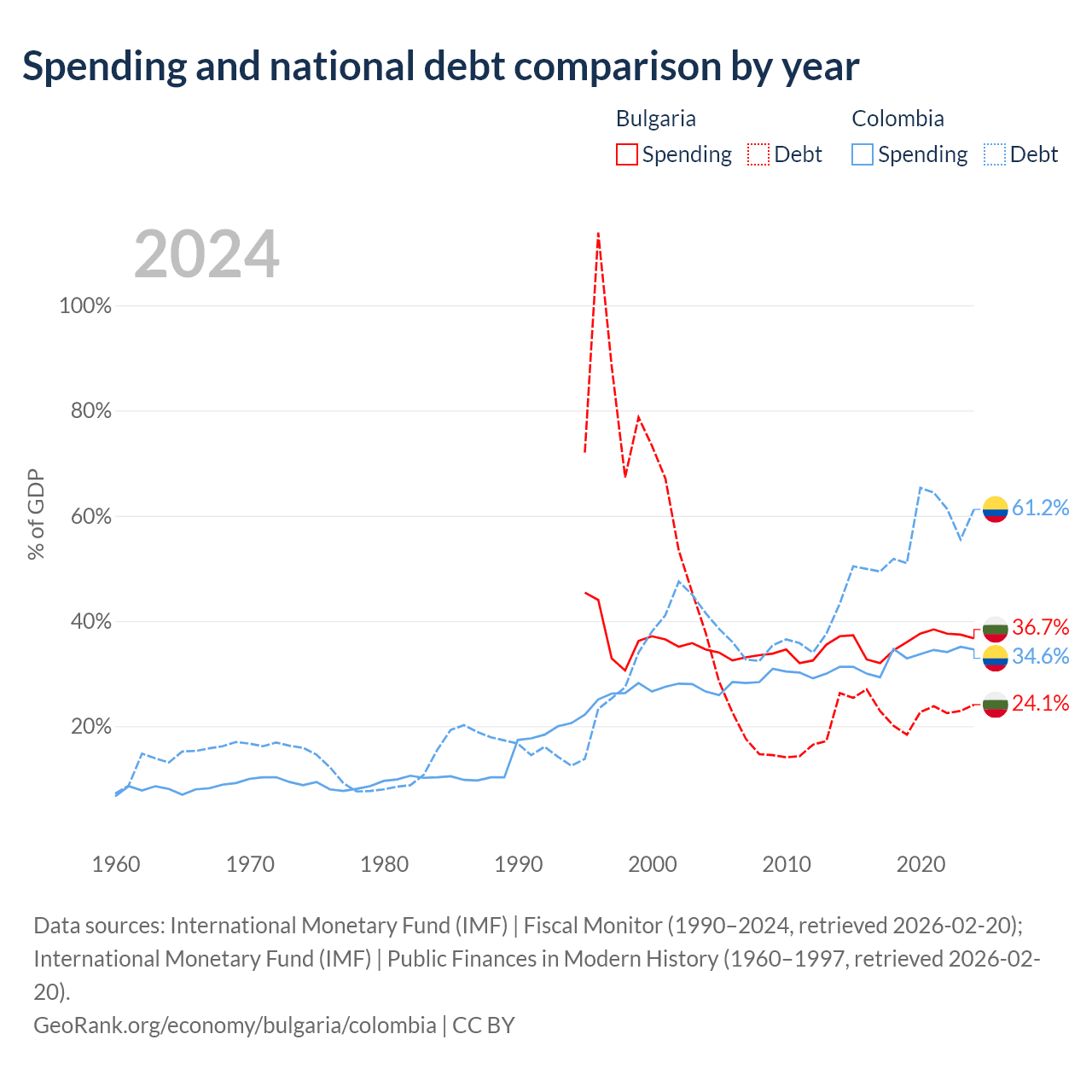 Bulgaria has $27.3B in government debt (24.1% of GDP), compared to $256B (61.2% of GDP) in Colombia.