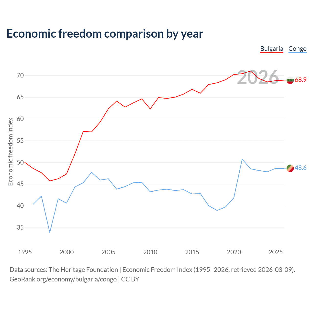 The Economic Freedom Index for Bulgaria is 68.9, ranking 44/197, compared to 48.6 for the Congo, ranking 169/197. The chart above displays a comparison of annual changes in economic freedom indexes.