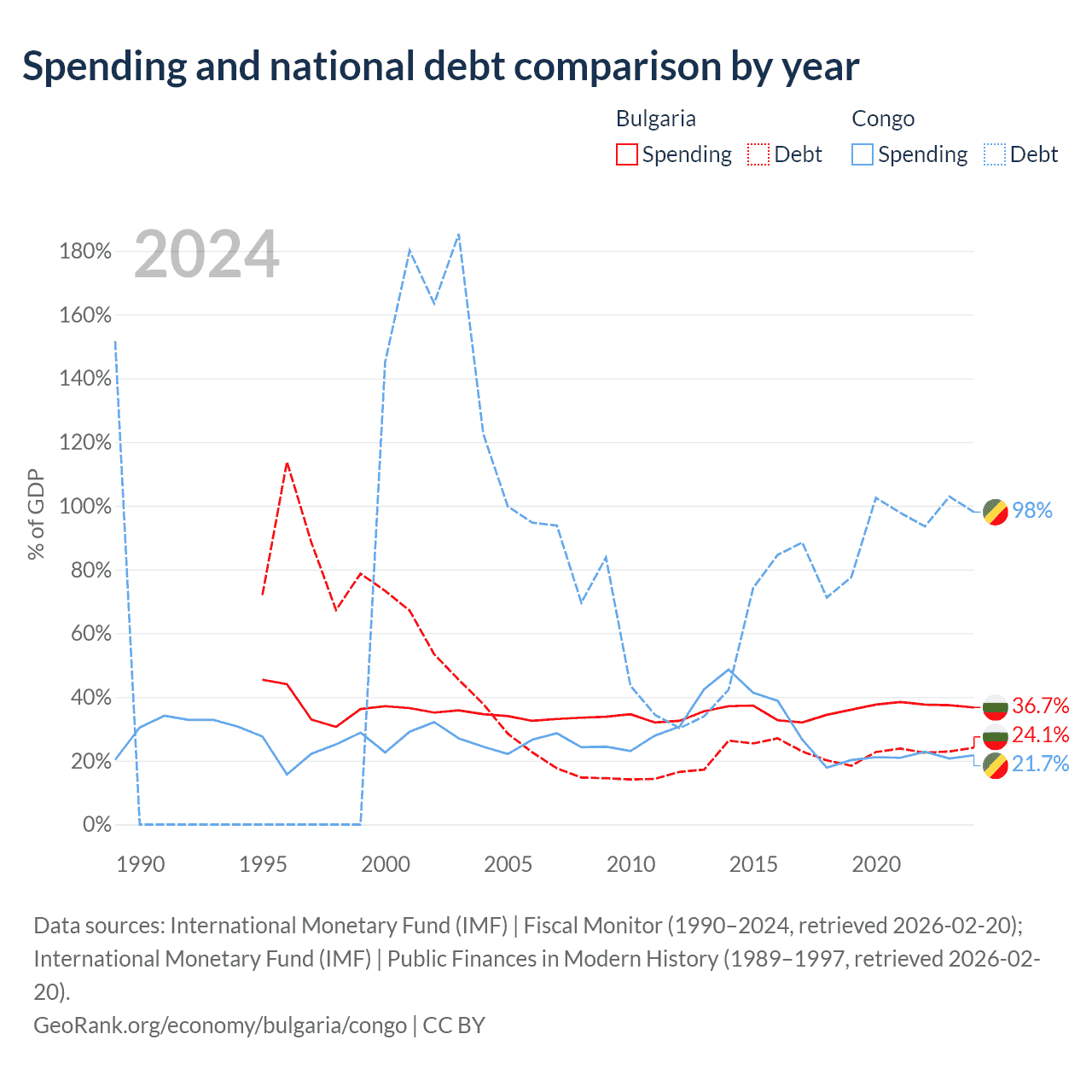 Bulgaria has $27.3B in government debt (24.1% of GDP), compared to $15.4B (98% of GDP) in the Congo.