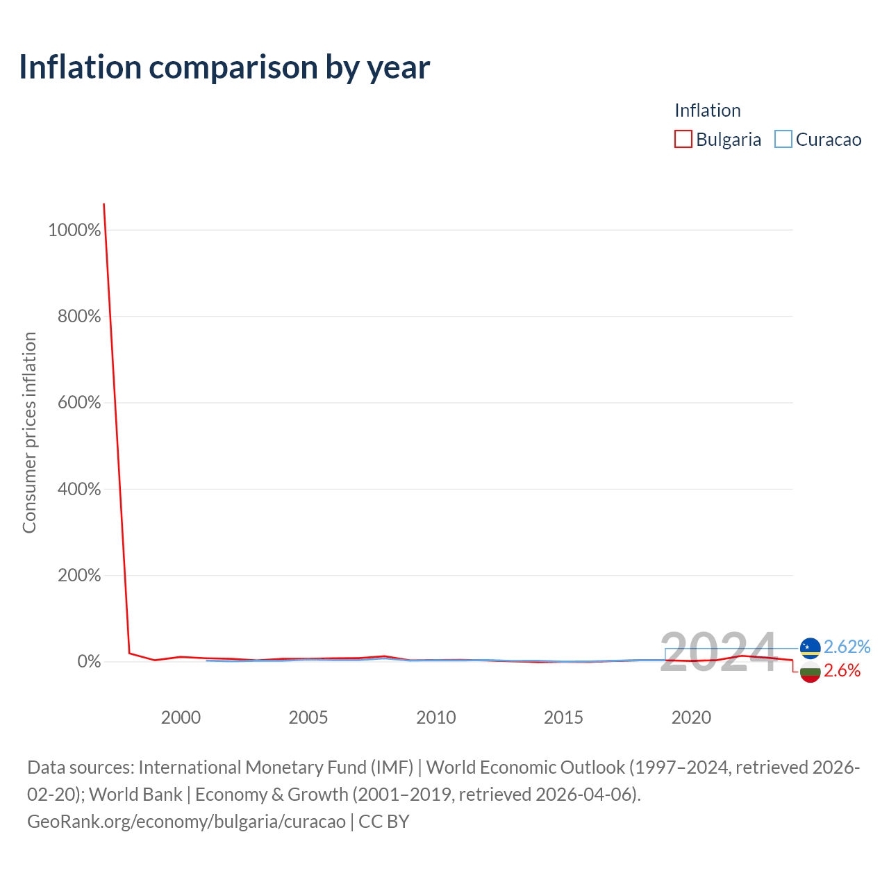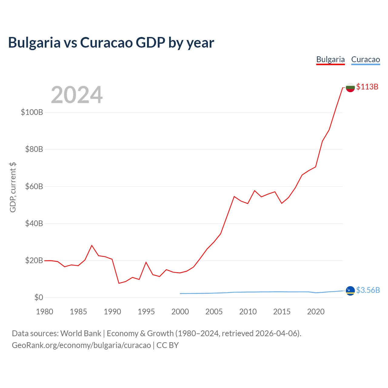 Bulgaria has a GDP of $113B compared to $3.56B for Curacao, ranking 67/197 and 167/197 by economy size, respectively.