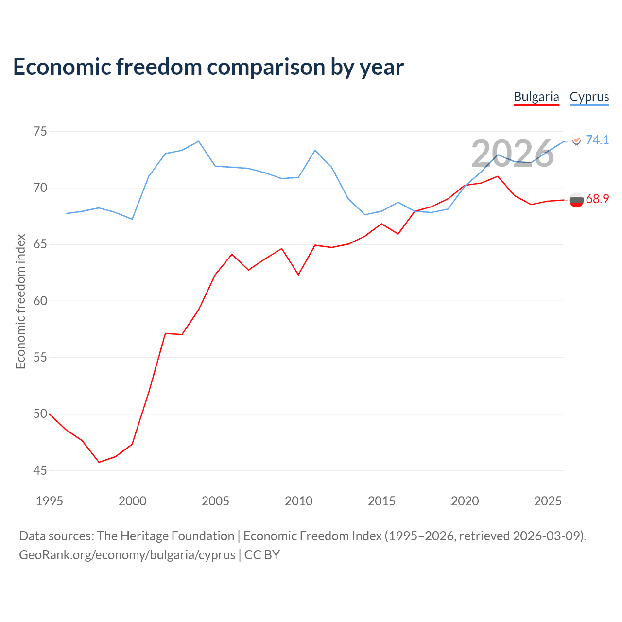The Economic Freedom Index for Bulgaria is 68.9, ranking 44/197, compared to 74.1 for Cyprus, ranking 21/197. The chart above displays a comparison of annual changes in economic freedom indexes.