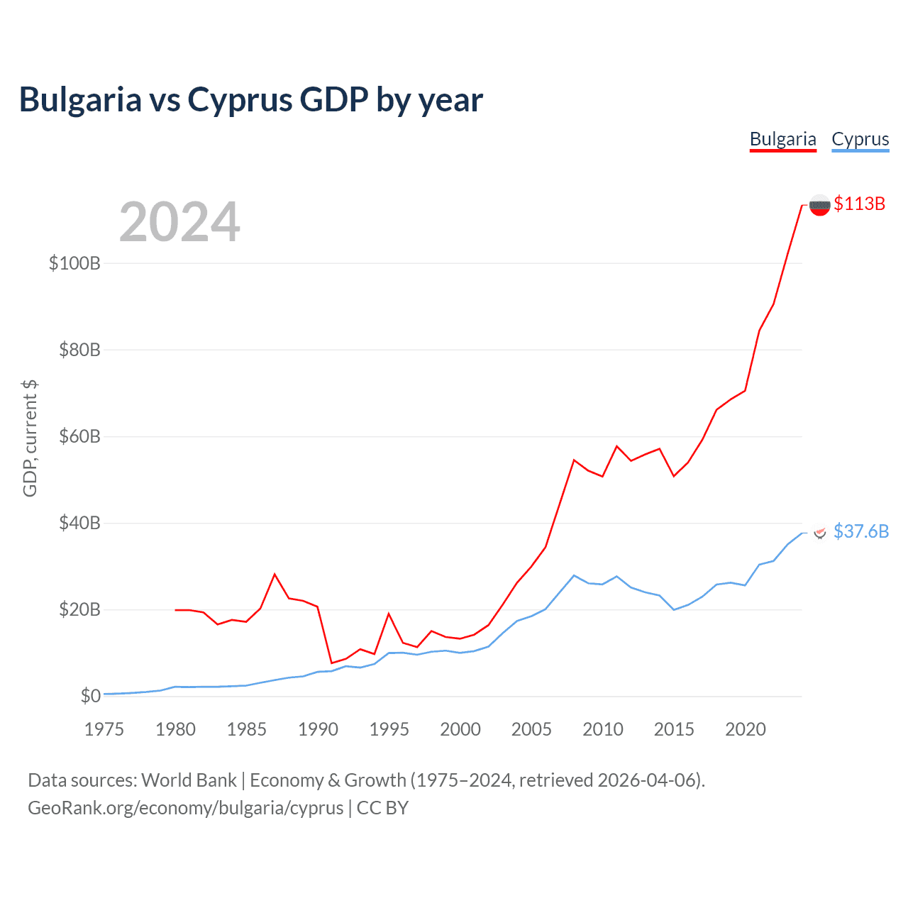Bulgaria has a GDP of $113B compared to $37.6B for Cyprus, ranking 67/197 and 103/197 by economy size, respectively.