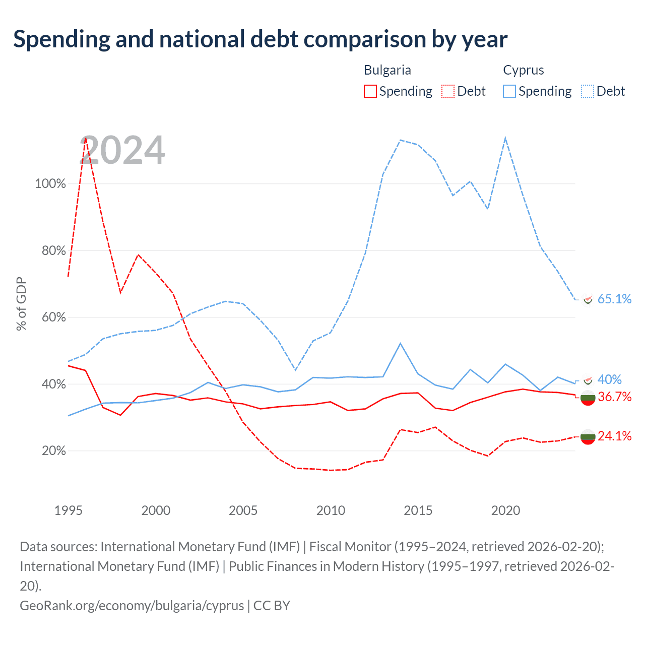 Bulgaria has $27.3B in government debt (24.1% of GDP), compared to $24.5B (65.1% of GDP) in Cyprus.