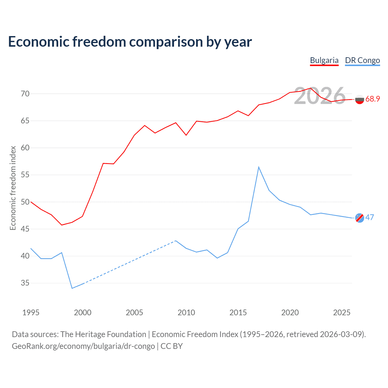 The Economic Freedom Index for Bulgaria is 68.9, ranking 44/197, compared to 47 for the DR Congo, ranking 176/197. The chart above displays a comparison of annual changes in economic freedom indexes.