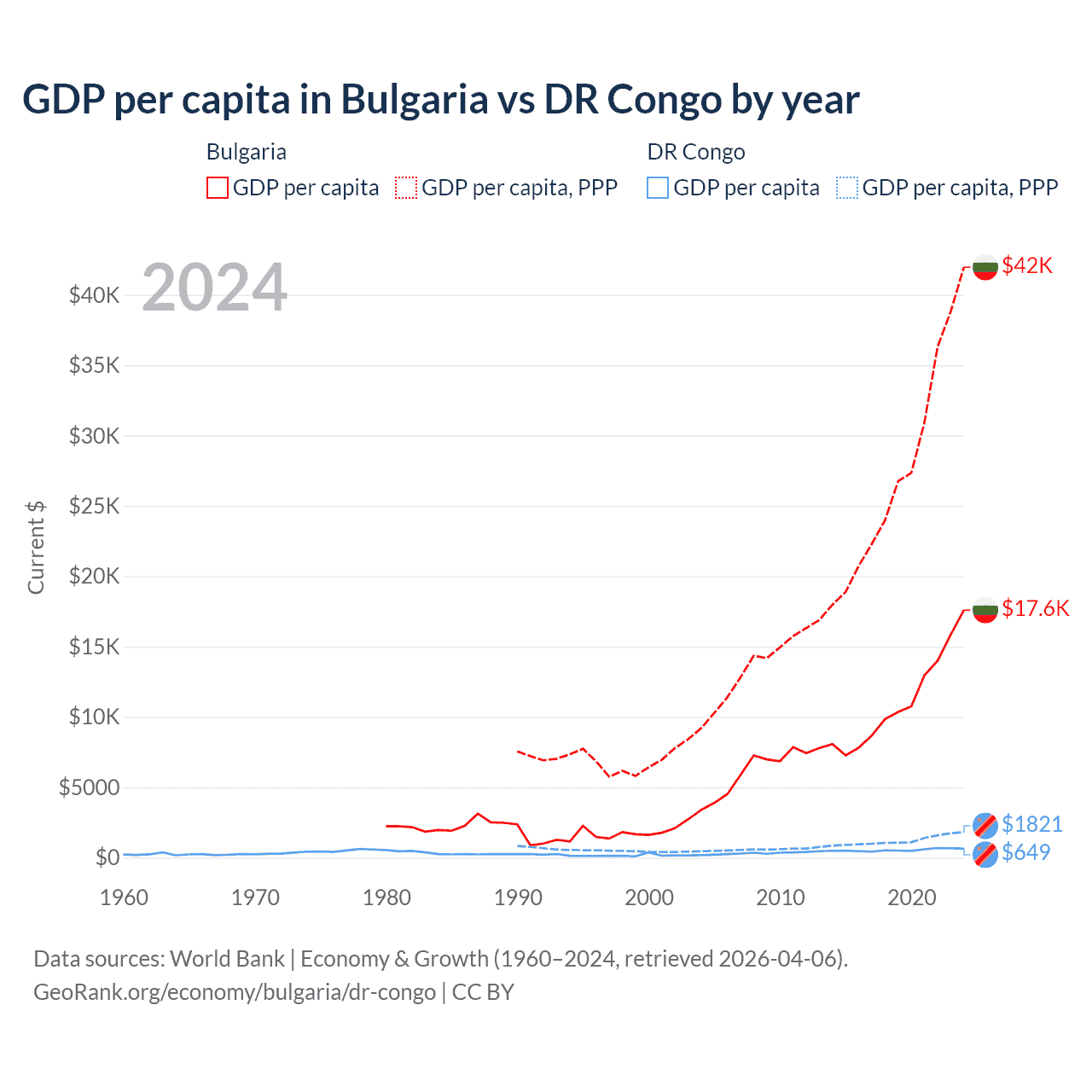 GDP per capita in Bulgaria vs DR Congo by year
