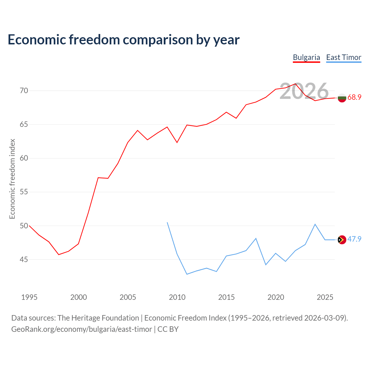 The Economic Freedom Index for Bulgaria is 68.9, ranking 44/197, compared to 47.9 for East Timor, ranking 173/197. The chart above displays a comparison of annual changes in economic freedom indexes.