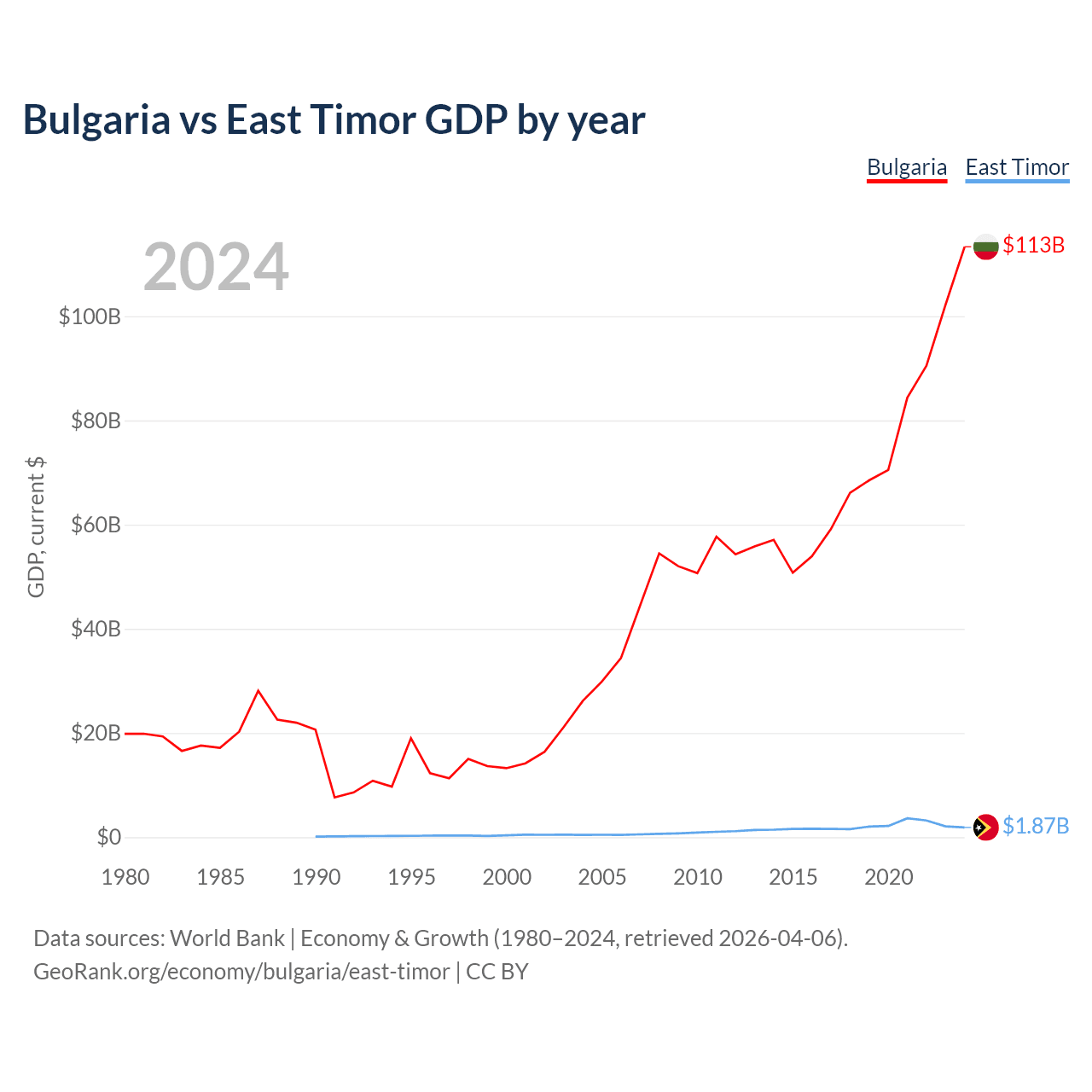 Bulgaria has a GDP of $113B compared to $1.87B for East Timor, ranking 67/197 and 181/197 by economy size, respectively.