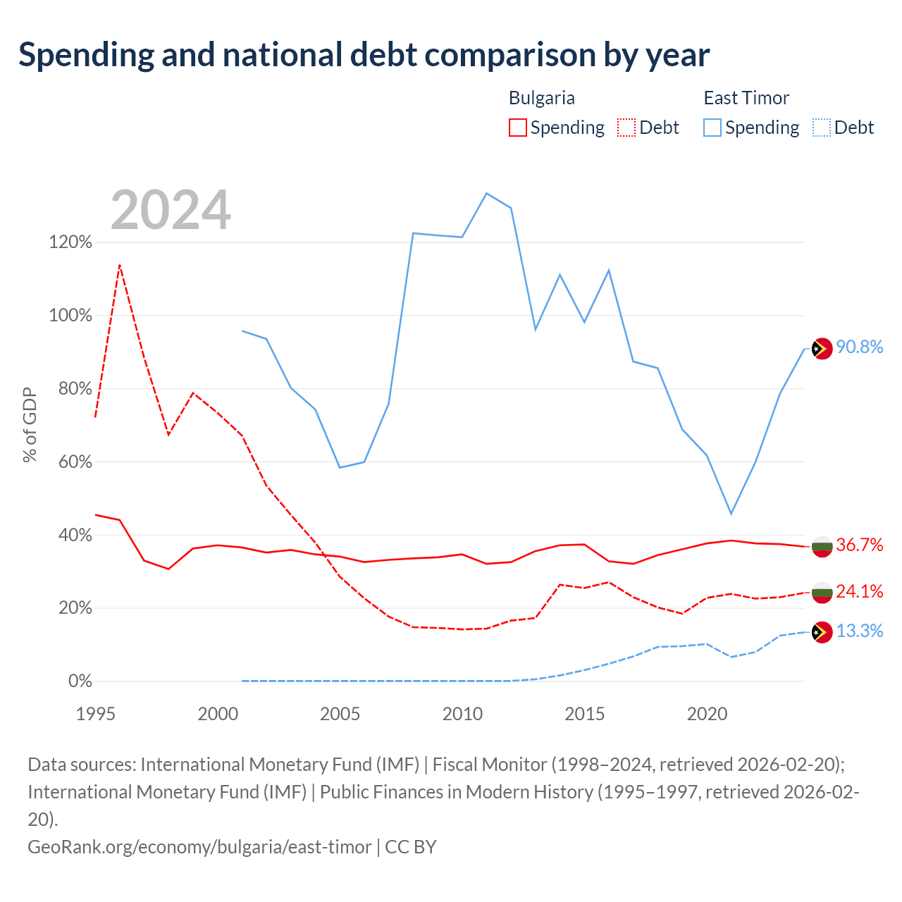 Bulgaria has $27.3B in government debt (24.1% of GDP), compared to $249M (13.3% of GDP) in East Timor.