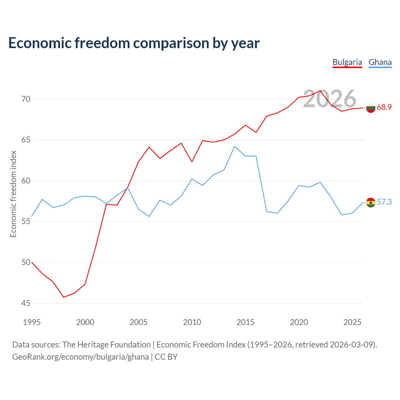 The Economic Freedom Index for Bulgaria is 68.9, ranking 44/197, compared to 57.3 for Ghana, ranking 118/197. The chart above displays a comparison of annual changes in economic freedom indexes.