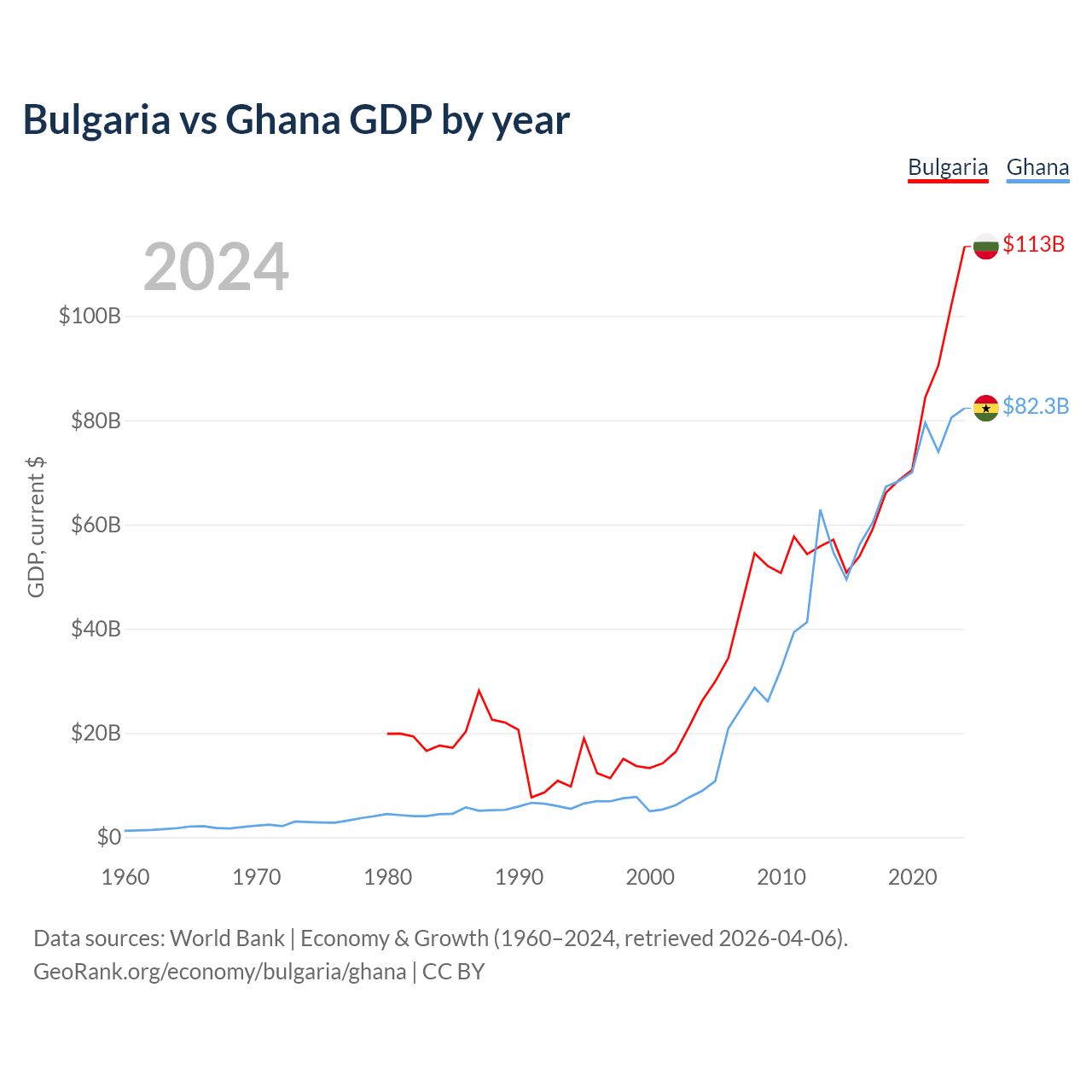 Bulgaria has a GDP of $113B compared to $82.3B for Ghana, ranking 67/197 and 80/197 by economy size, respectively.