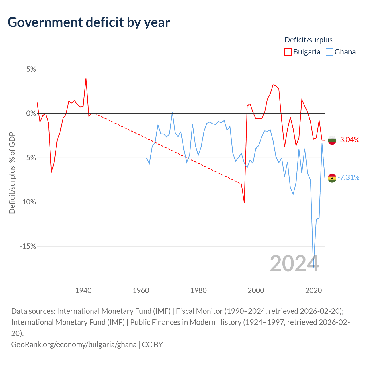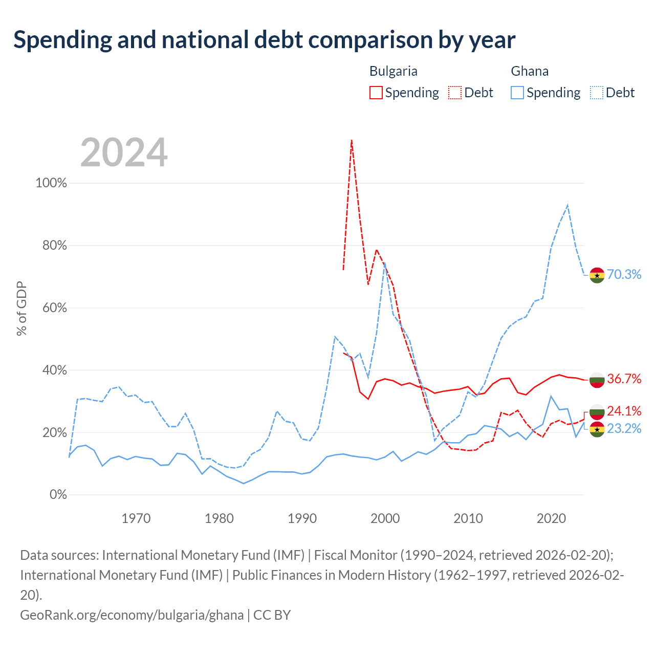 Bulgaria has $27.3B in government debt (24.1% of GDP), compared to $57.9B (70.3% of GDP) in Ghana.