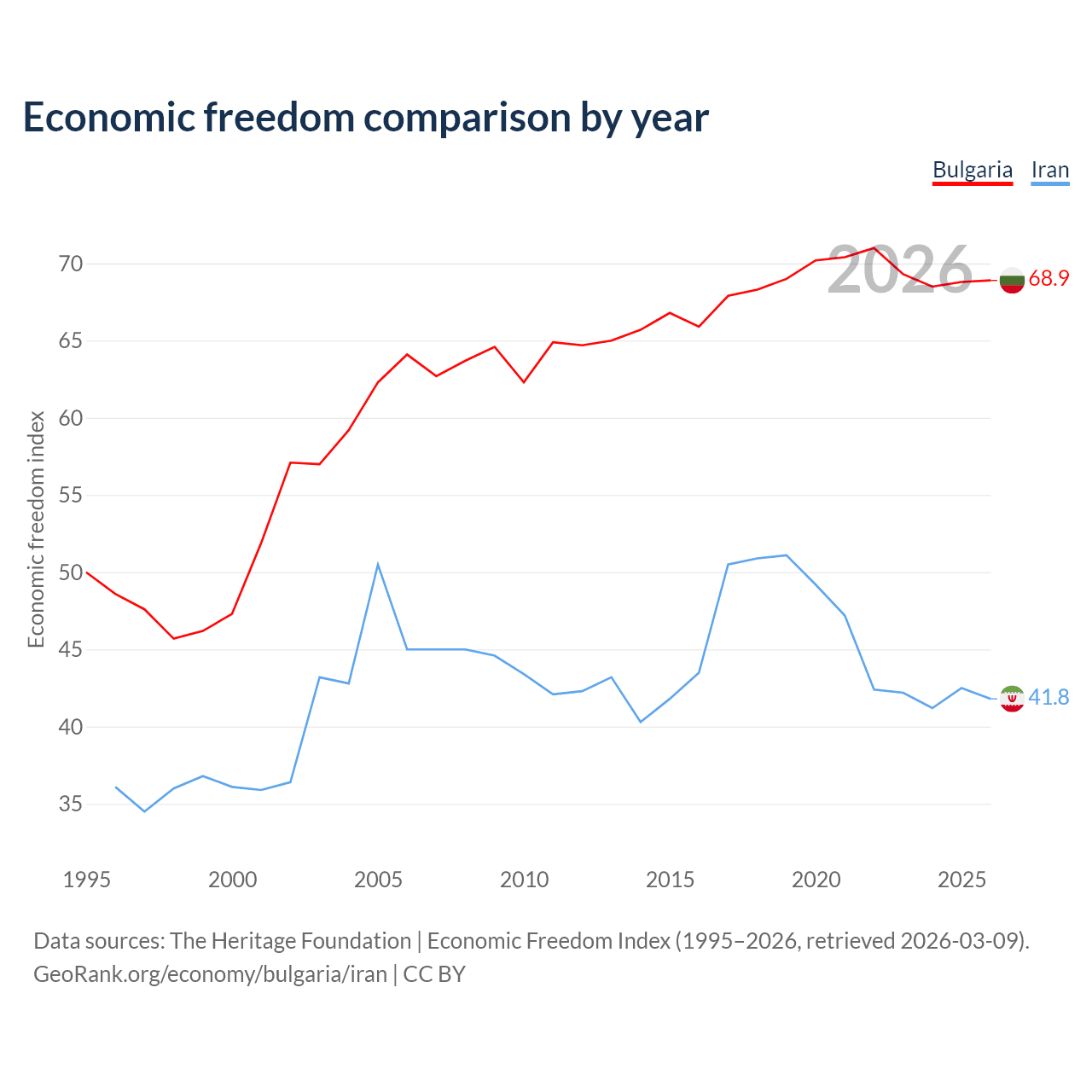 The Economic Freedom Index for Bulgaria is 68.9, ranking 44/197, compared to 41.8 for Iran, ranking 185/197. The chart above displays a comparison of annual changes in economic freedom indexes.