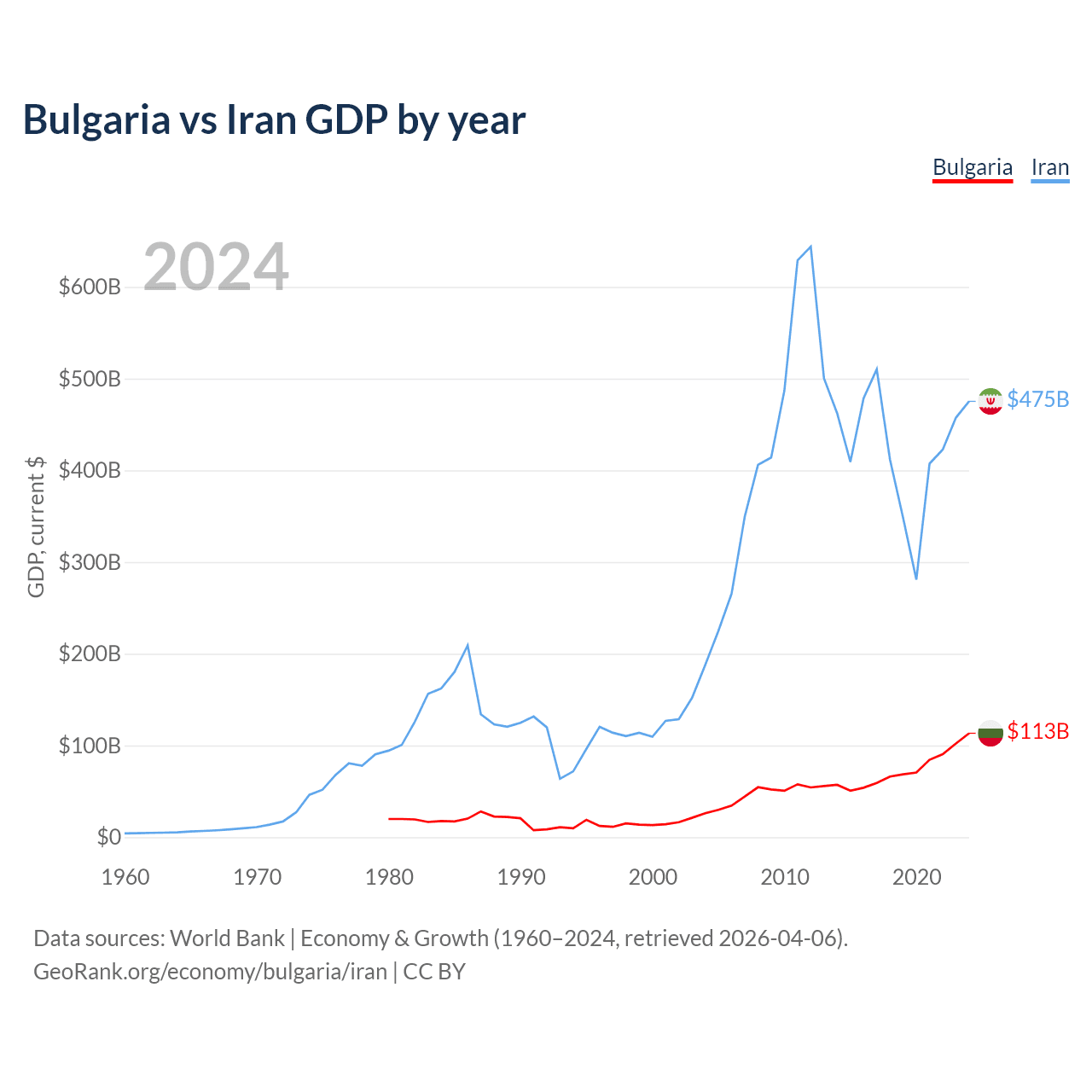 Bulgaria has a GDP of $113B compared to $475B for Iran, ranking 67/197 and 34/197 by economy size, respectively.