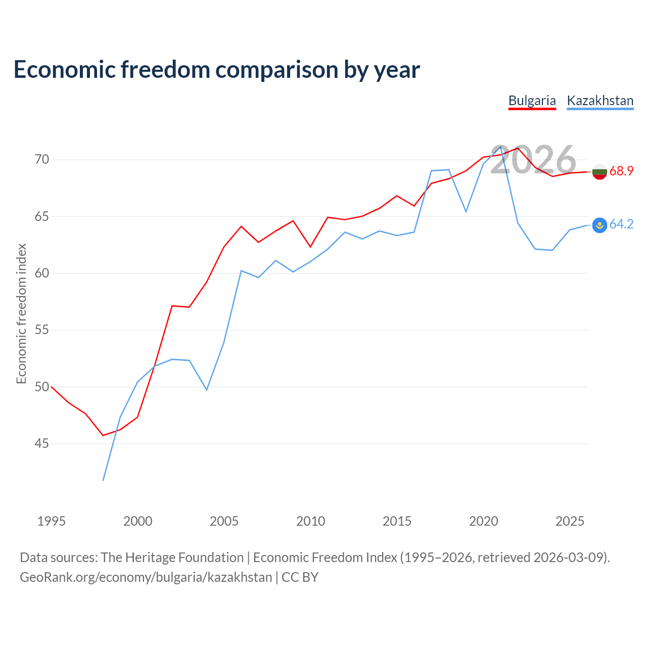 The Economic Freedom Index for Bulgaria is 68.9, ranking 44/197, compared to 64.2 for Kazakhstan, ranking 75/197. The chart above displays a comparison of annual changes in economic freedom indexes.