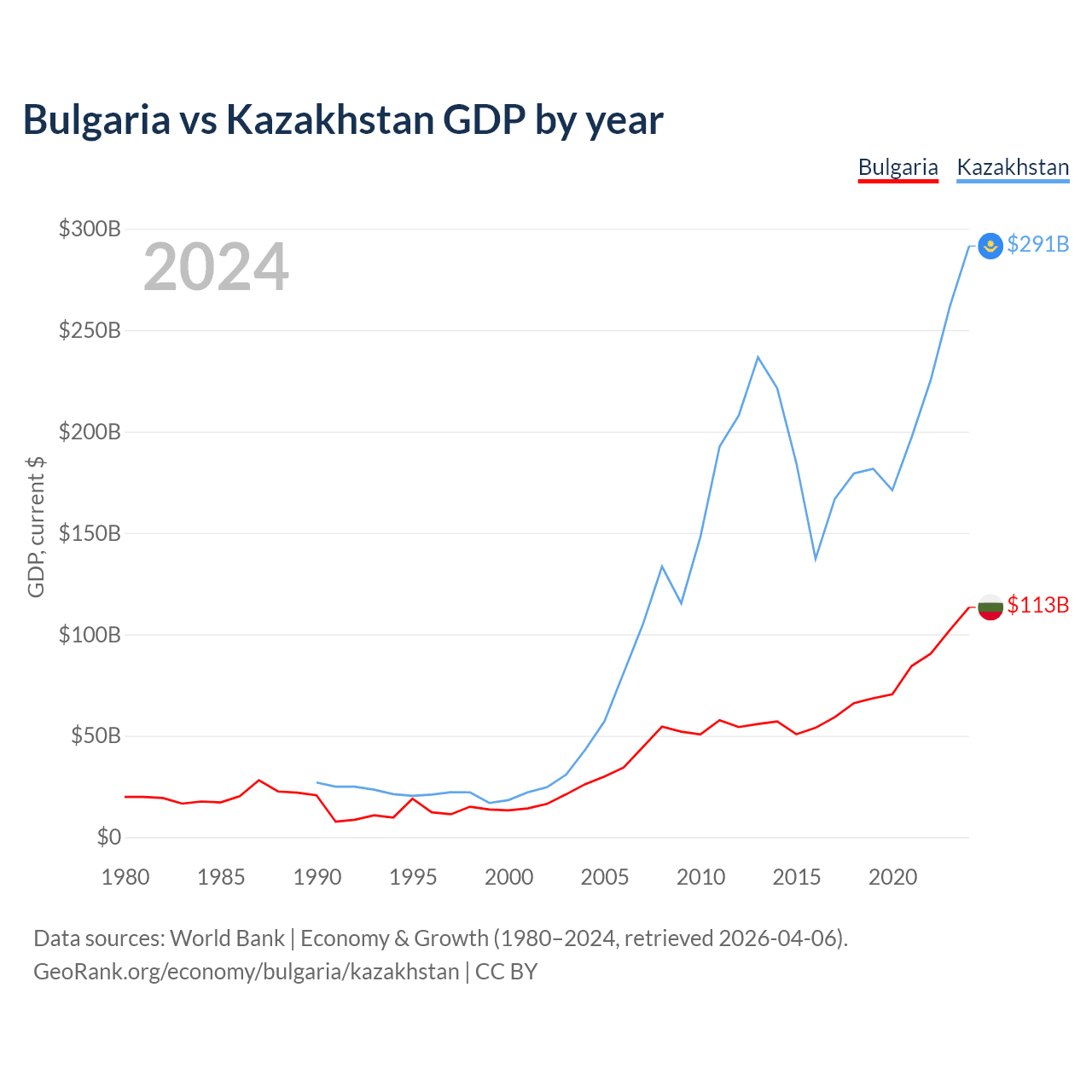 Bulgaria has a GDP of $113B compared to $291B for Kazakhstan, ranking 67/197 and 48/197 by economy size, respectively.