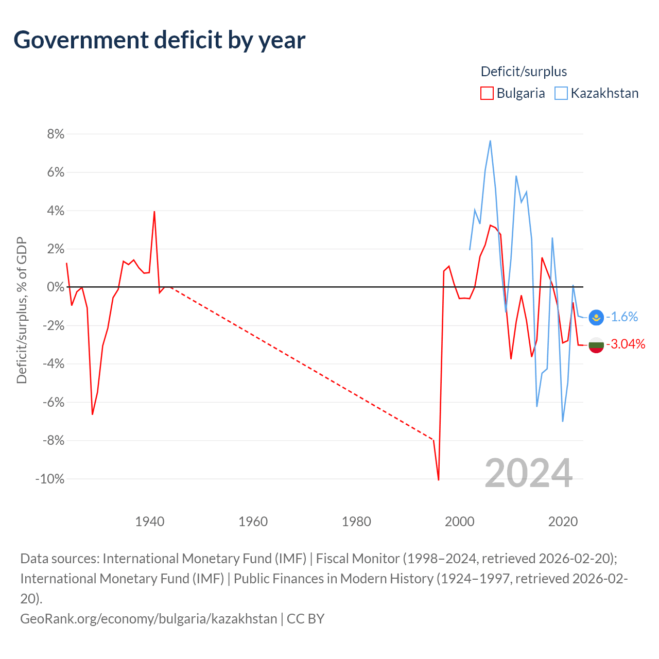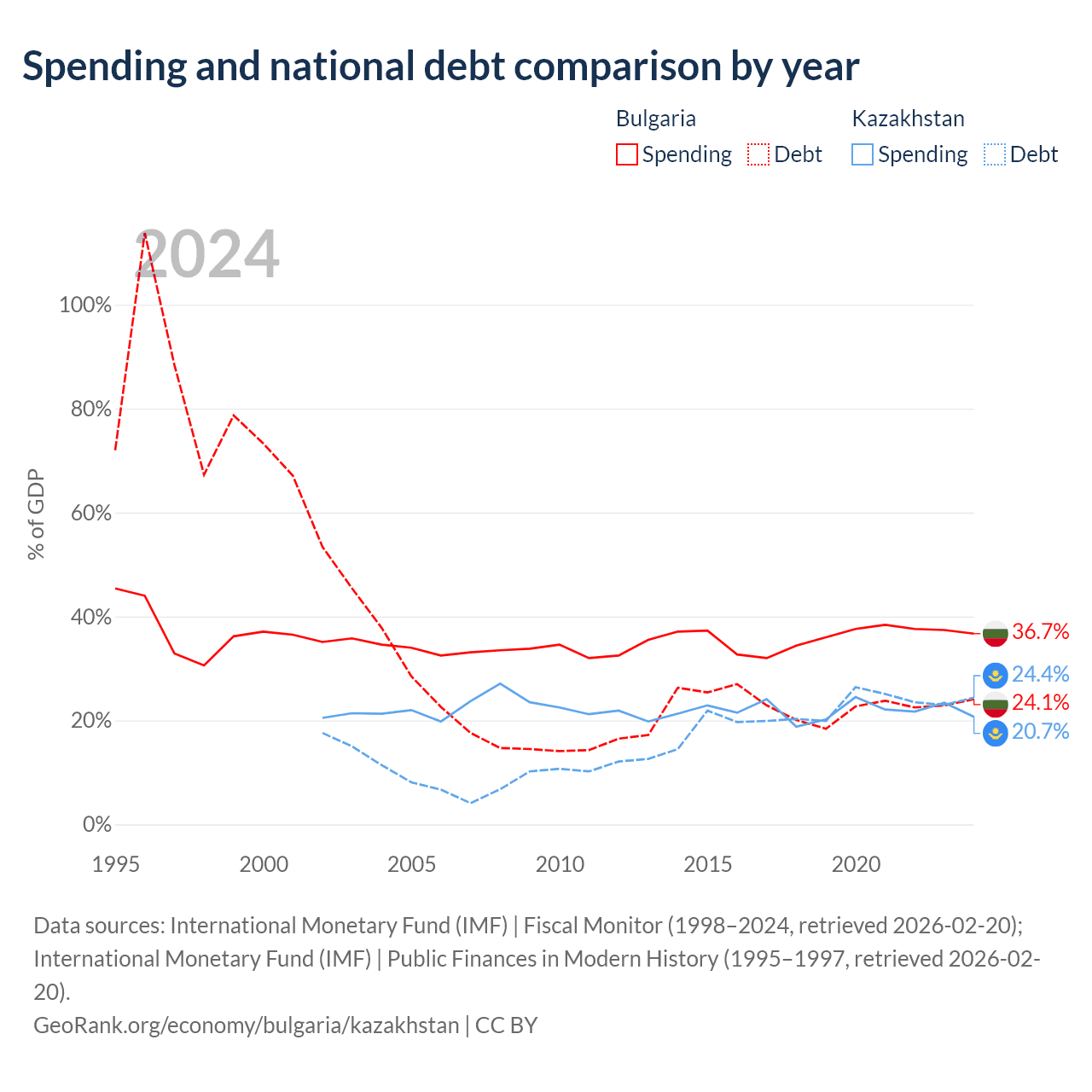 Bulgaria has $27.3B in government debt (24.1% of GDP), compared to $71.1B (24.4% of GDP) in Kazakhstan.