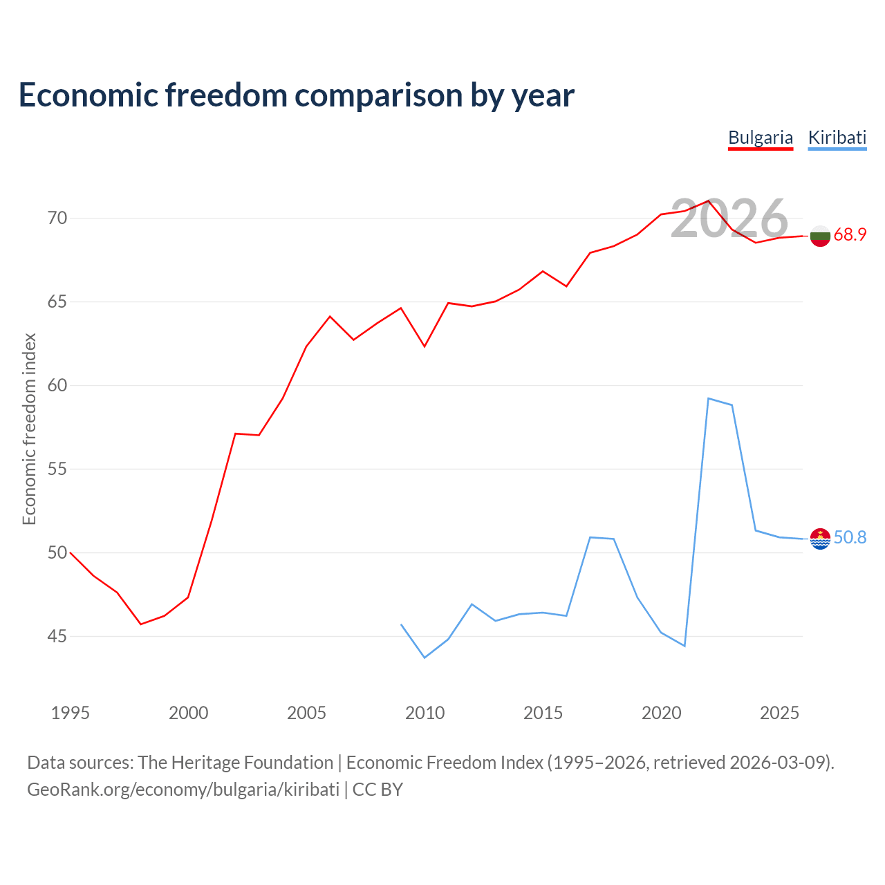 The Economic Freedom Index for Bulgaria is 68.9, ranking 44/197, compared to 50.8 for Kiribati, ranking 158/197. The chart above displays a comparison of annual changes in economic freedom indexes.