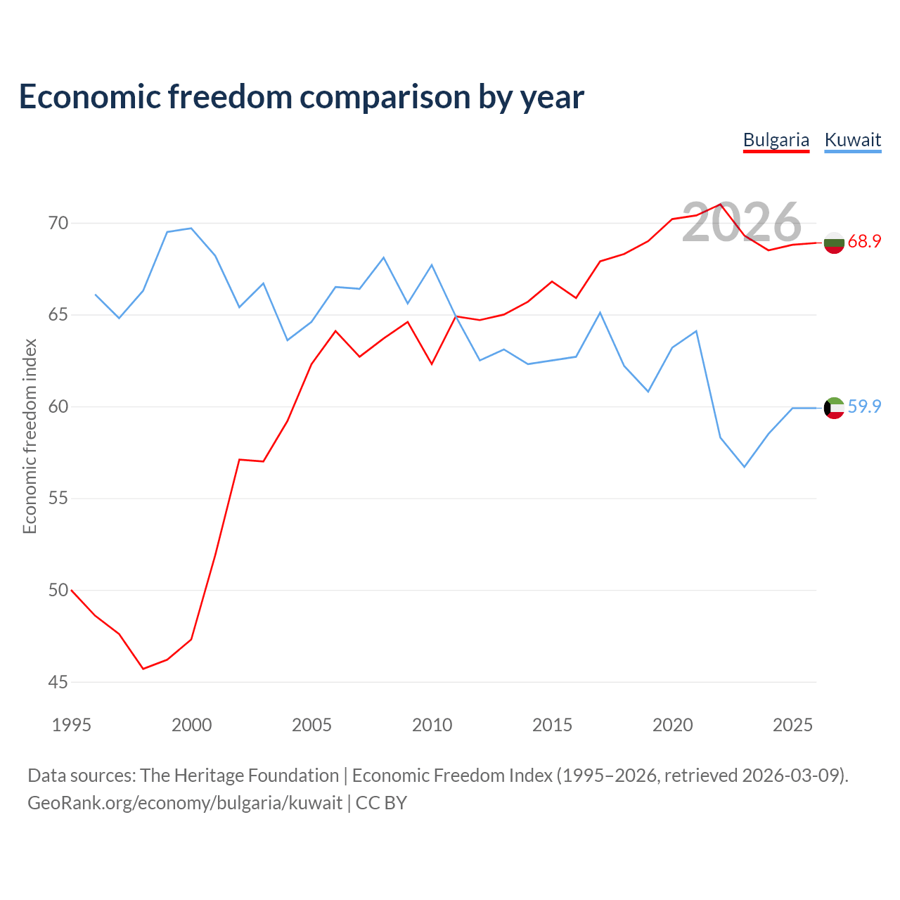 The Economic Freedom Index for Bulgaria is 68.9, ranking 44/197, compared to 59.9 for Kuwait, ranking 100/197. The chart above displays a comparison of annual changes in economic freedom indexes.