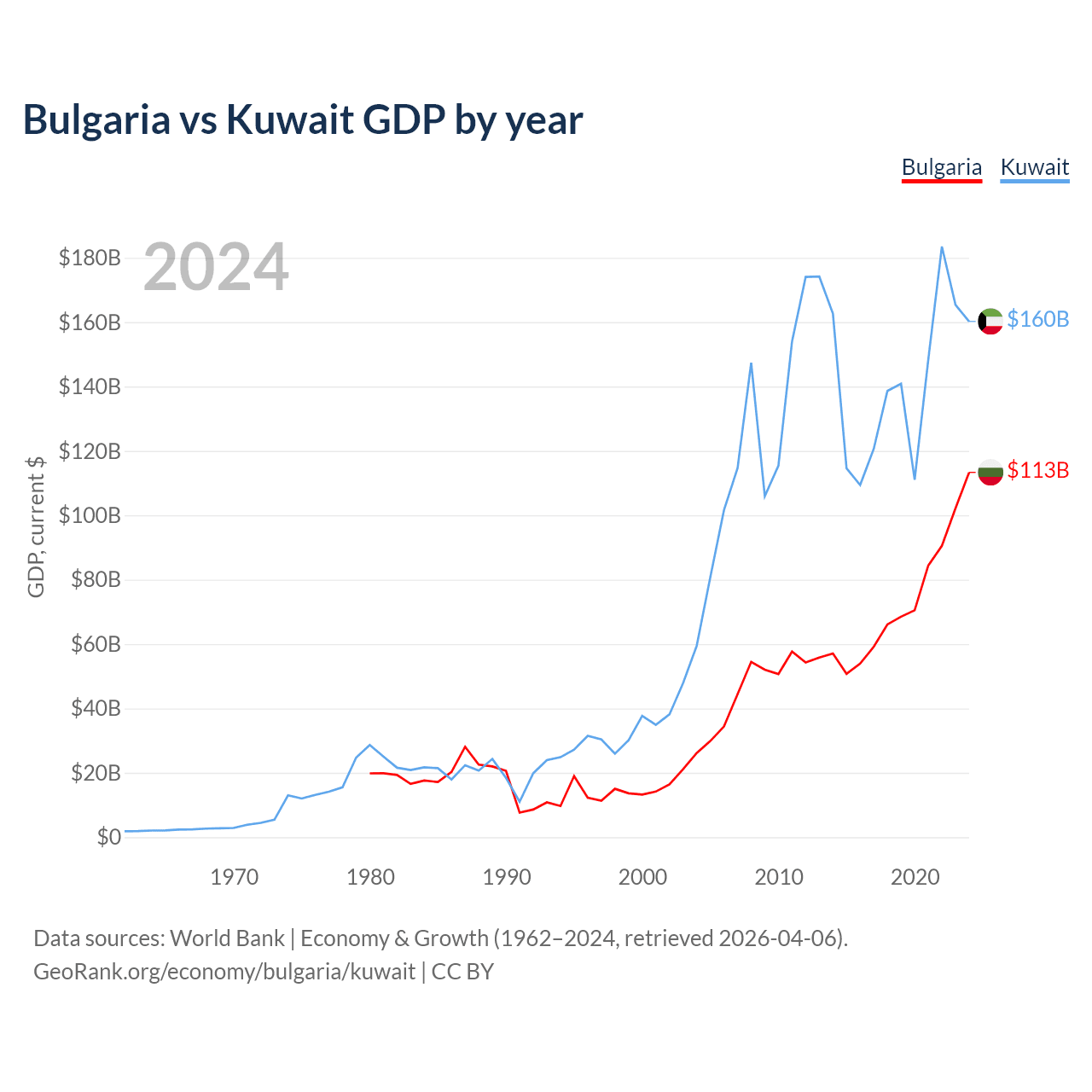 Bulgaria has a GDP of $113B compared to $160B for Kuwait, ranking 67/197 and 59/197 by economy size, respectively.