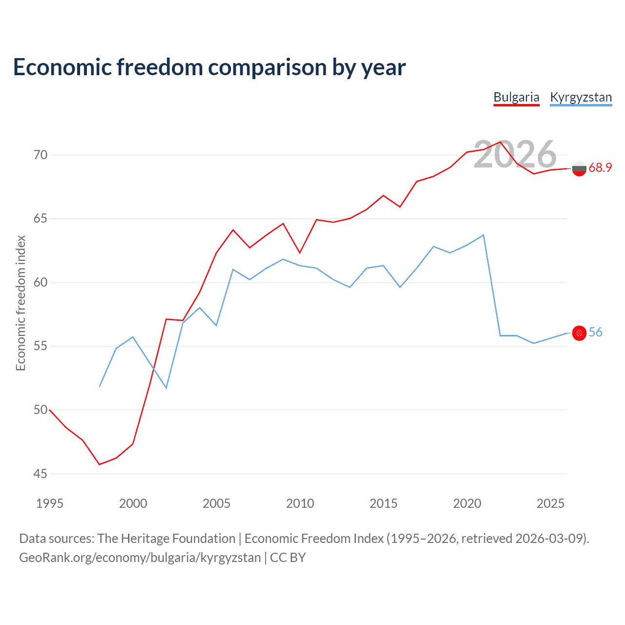 The Economic Freedom Index for Bulgaria is 68.9, ranking 44/197, compared to 56 for Kyrgyzstan, ranking 126/197. The chart above displays a comparison of annual changes in economic freedom indexes.