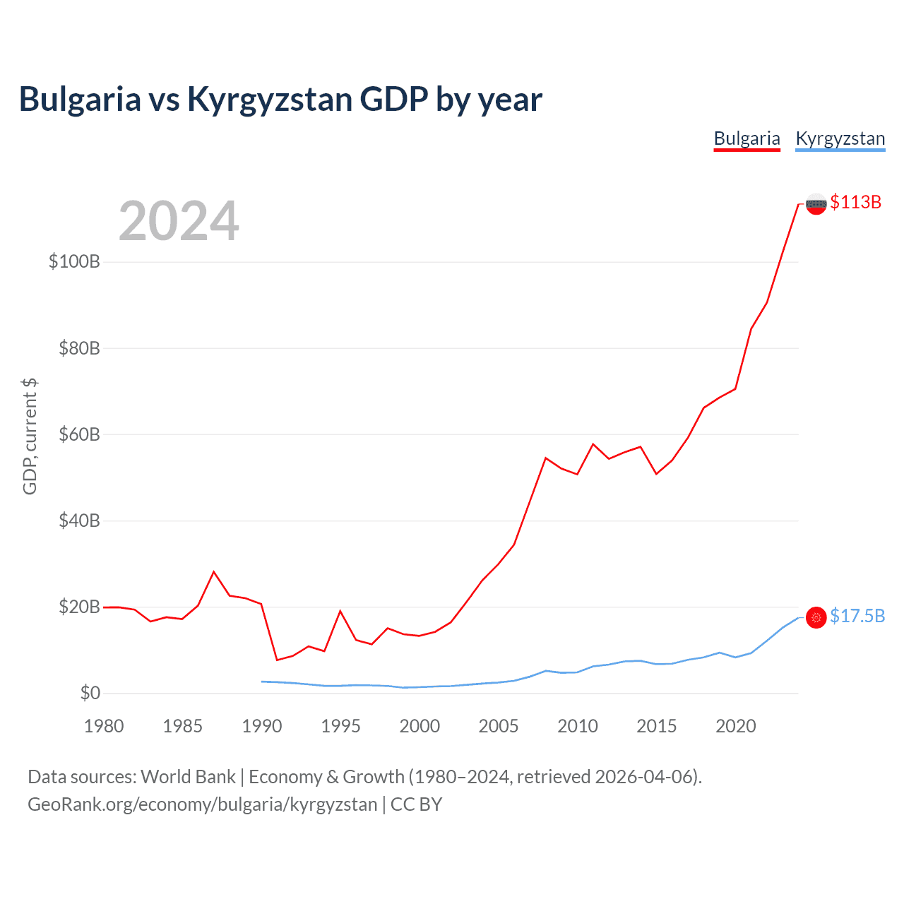 Bulgaria has a GDP of $113B compared to $17.5B for Kyrgyzstan, ranking 67/197 and 135/197 by economy size, respectively.