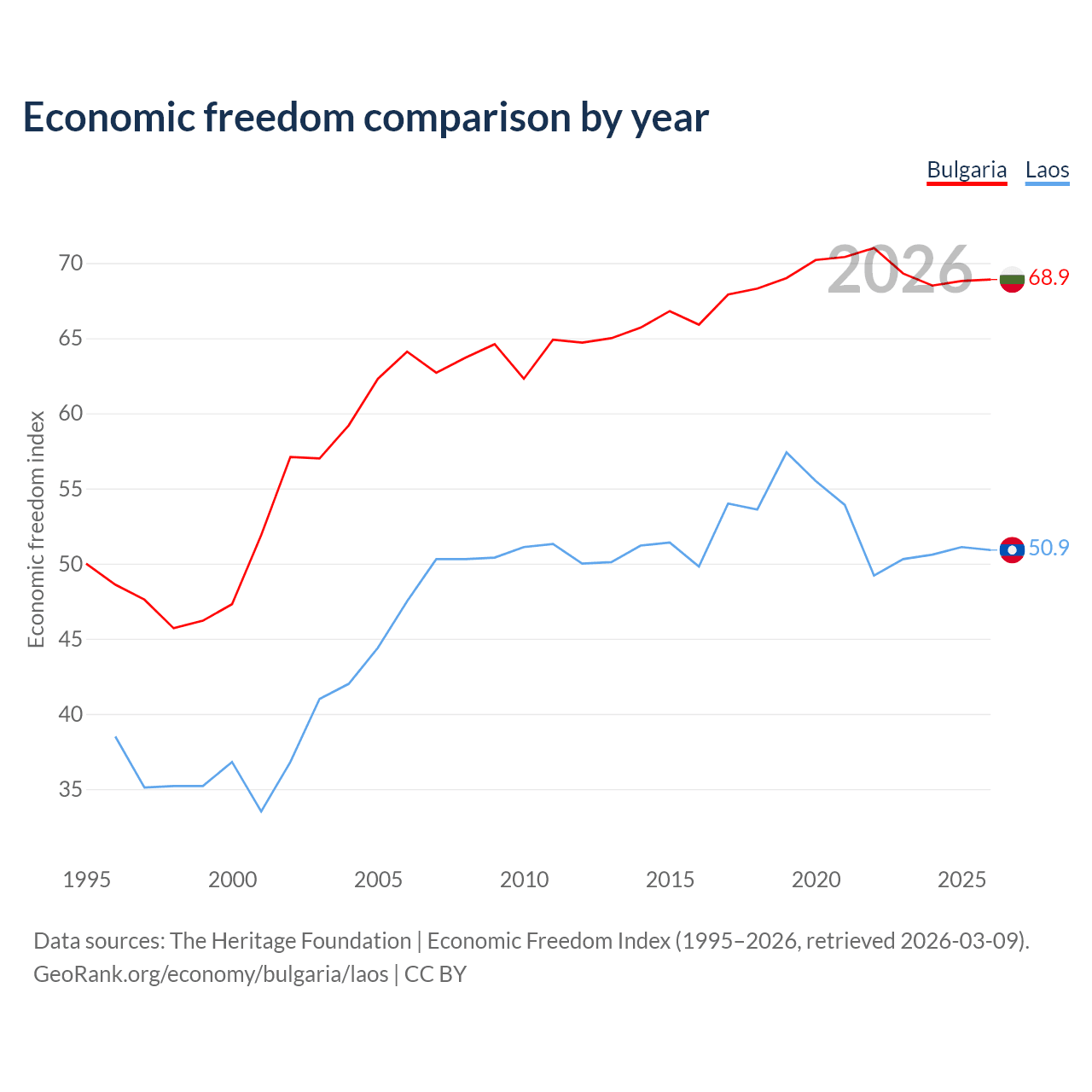 The Economic Freedom Index for Bulgaria is 68.9, ranking 44/197, compared to 50.9 for Laos, ranking 157/197. The chart above displays a comparison of annual changes in economic freedom indexes.