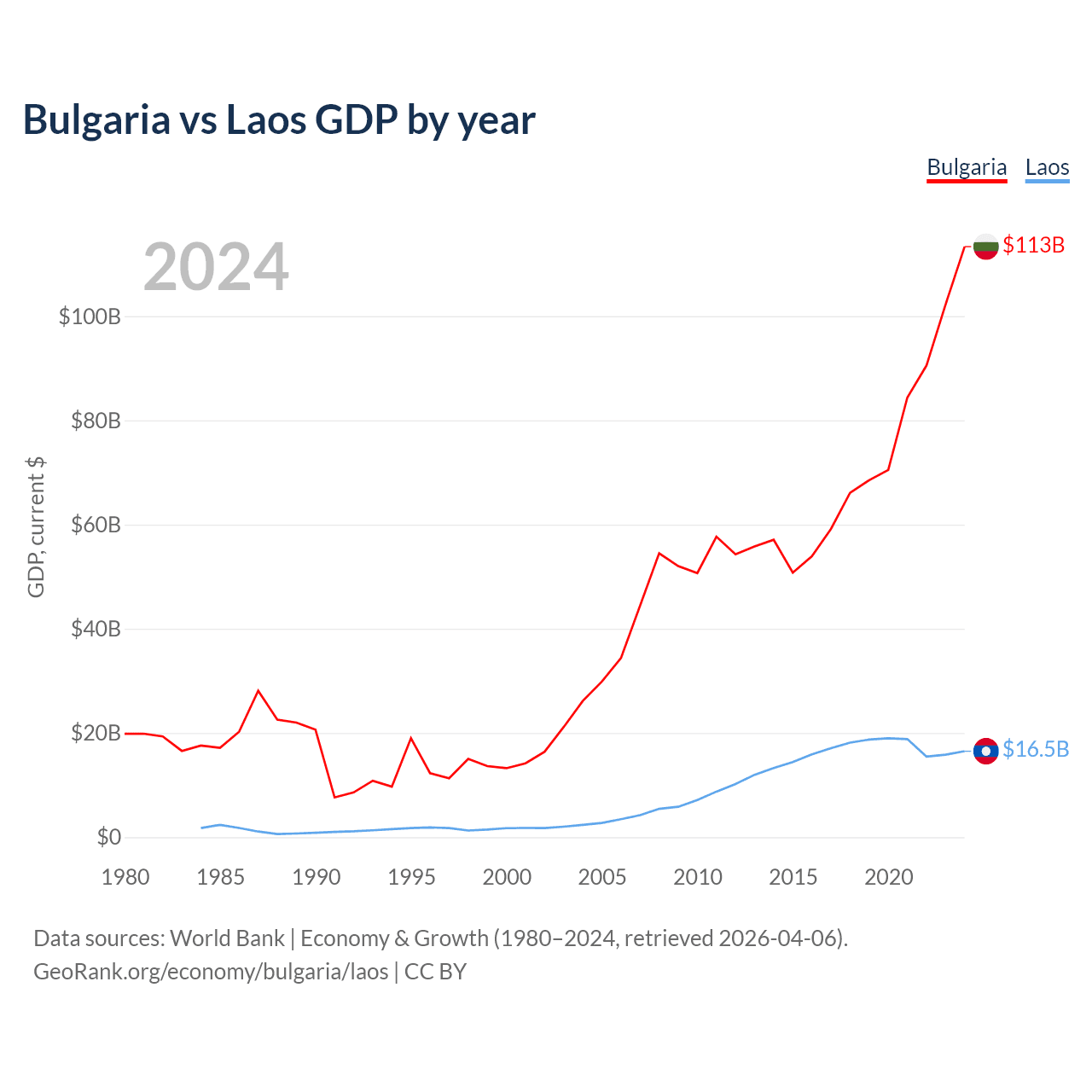 Bulgaria has a GDP of $113B compared to $16.5B for Laos, ranking 67/197 and 139/197 by economy size, respectively.