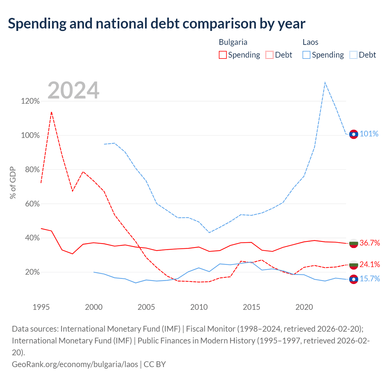 Bulgaria has $27.3B in government debt (24.1% of GDP), compared to $16.6B (100.5% of GDP) in Laos.