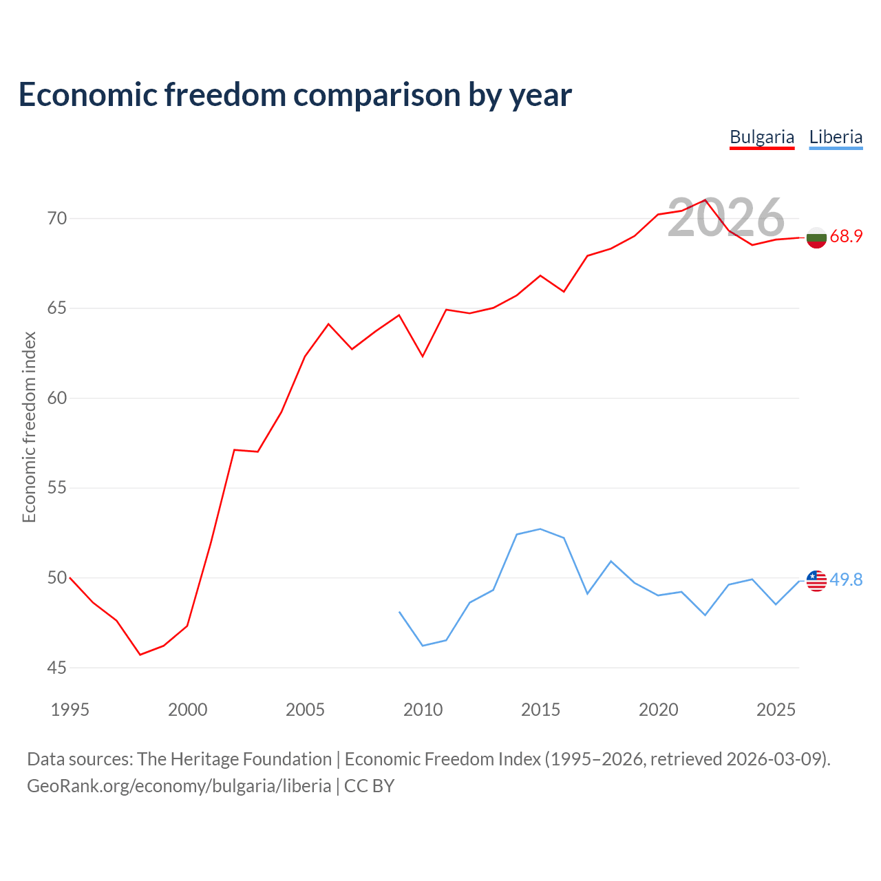 The Economic Freedom Index for Bulgaria is 68.9, ranking 44/197, compared to 49.8 for Liberia, ranking 163/197. The chart above displays a comparison of annual changes in economic freedom indexes.
