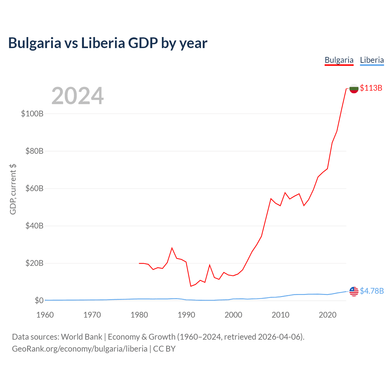 Bulgaria has a GDP of $113B compared to $4.78B for Liberia, ranking 67/197 and 163/197 by economy size, respectively.