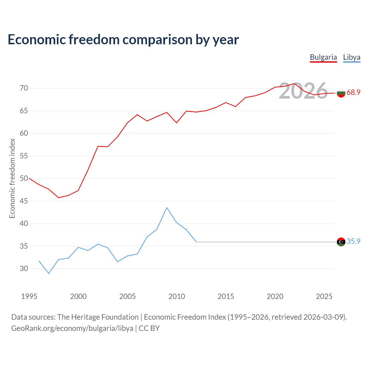 The Economic Freedom Index for Bulgaria is 68.9, ranking 44/197, compared to 35.9 for Libya, ranking 189/197. The chart above displays a comparison of annual changes in economic freedom indexes.