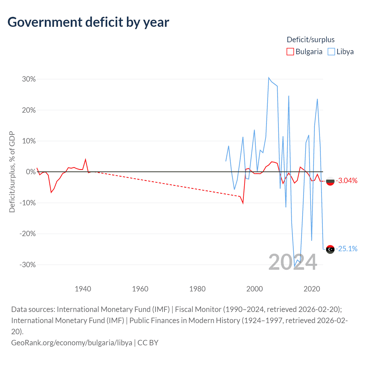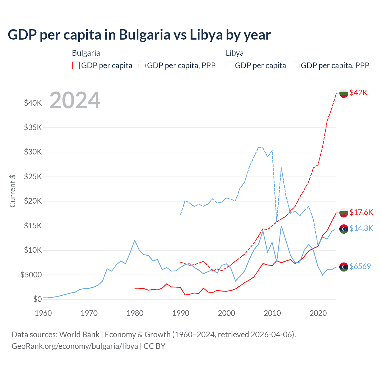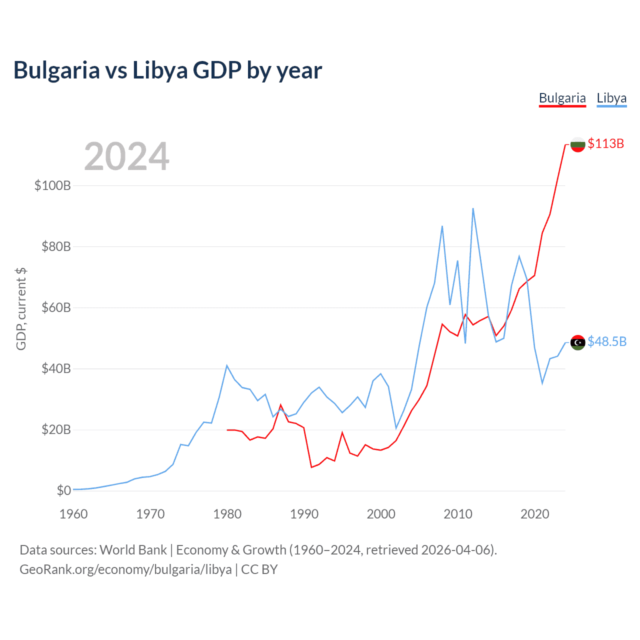 Bulgaria has a GDP of $113B compared to $48.5B for Libya, ranking 67/197 and 95/197 by economy size, respectively.