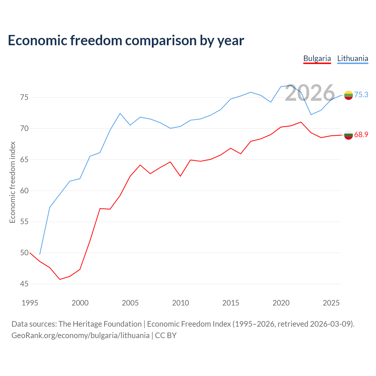 The Economic Freedom Index for Bulgaria is 68.9, ranking 44/197, compared to 75.3 for Lithuania, ranking 18/197. The chart above displays a comparison of annual changes in economic freedom indexes.