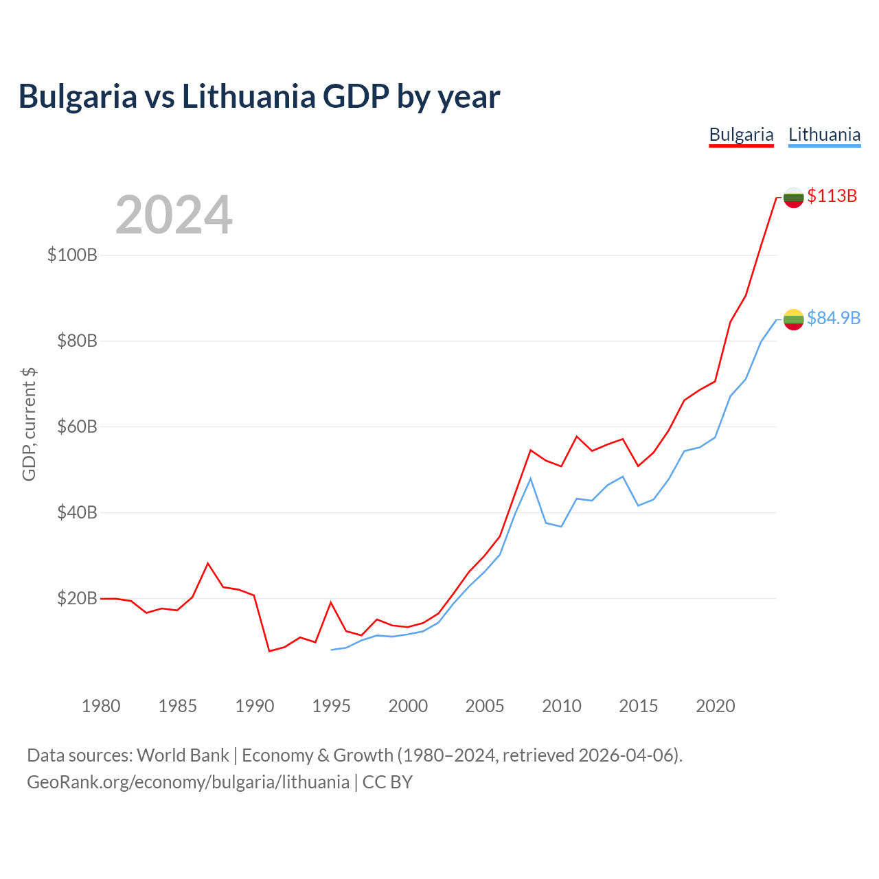Bulgaria vs Lithuania GDP by year