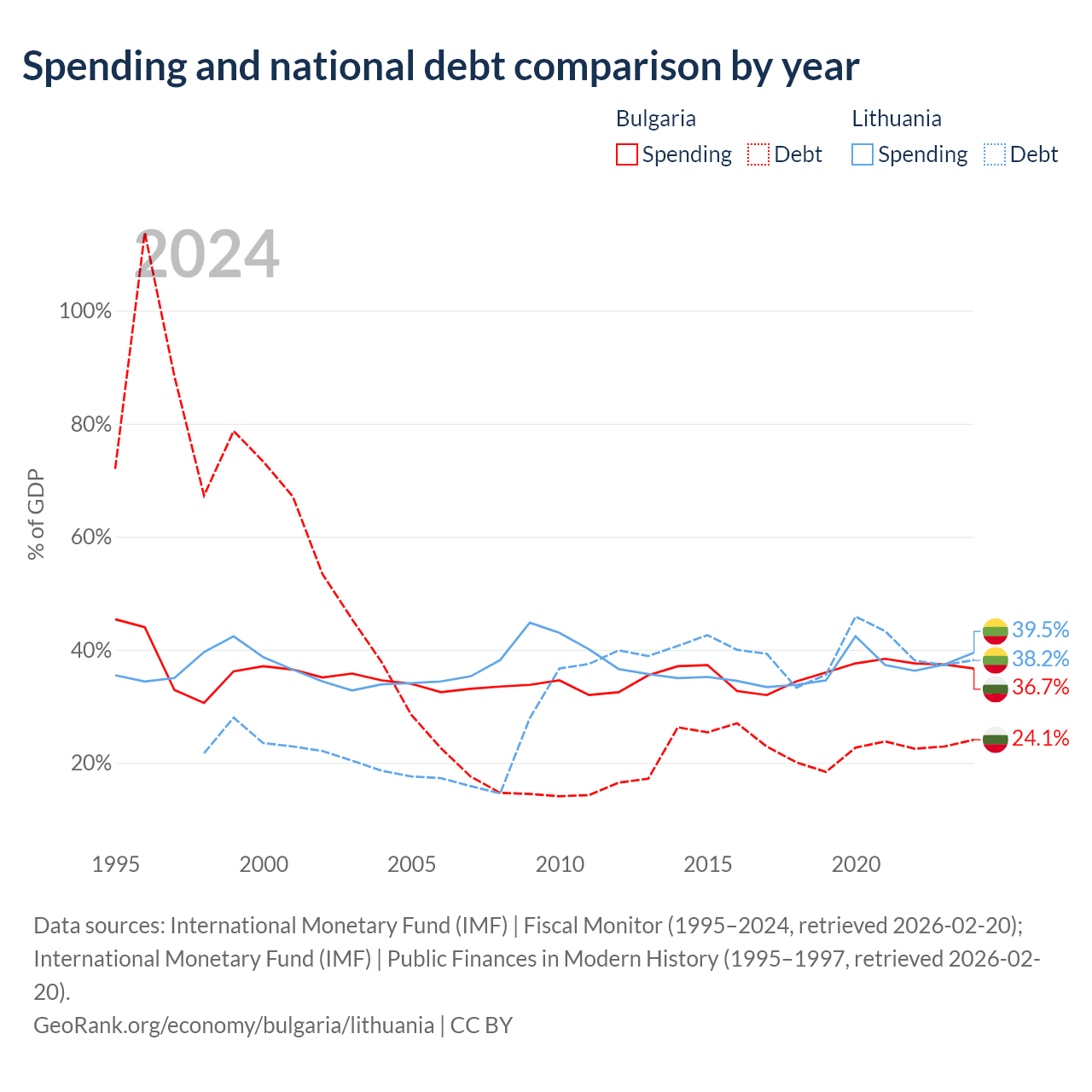 Bulgaria has $27.3B in government debt (24.1% of GDP), compared to $32.4B (38.2% of GDP) in Lithuania.