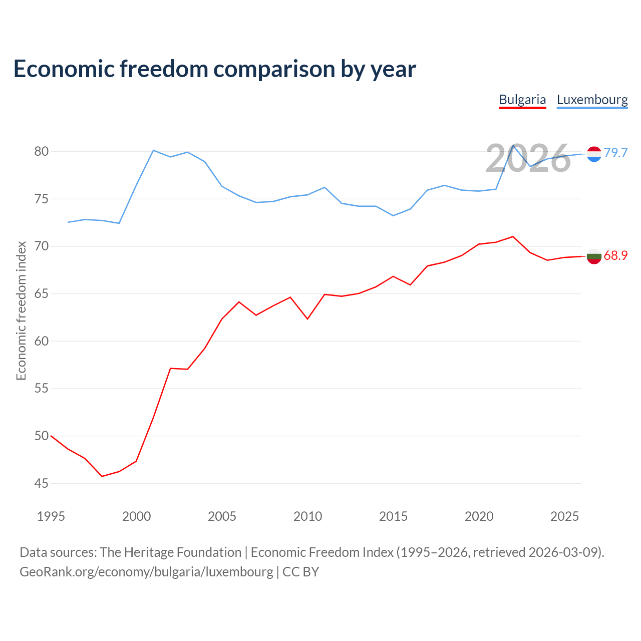 The Economic Freedom Index for Bulgaria is 68.9, ranking 44/197, compared to 79.7 for Luxembourg, ranking 7/197. The chart above displays a comparison of annual changes in economic freedom indexes.